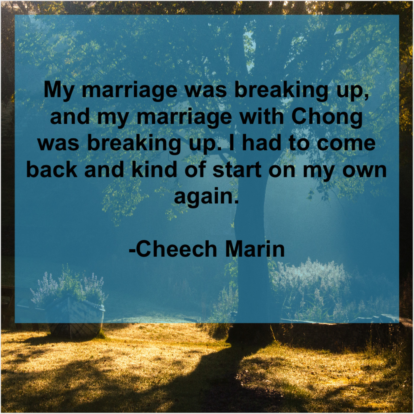 Cheech Marin Cheech Marin – My marriage was breaking up… July 27, 2019 admin “My marriage was breaking up, and my marriage with Chong was breaking up. I had to come back and kind of start on my own again.”-Cheech Marin