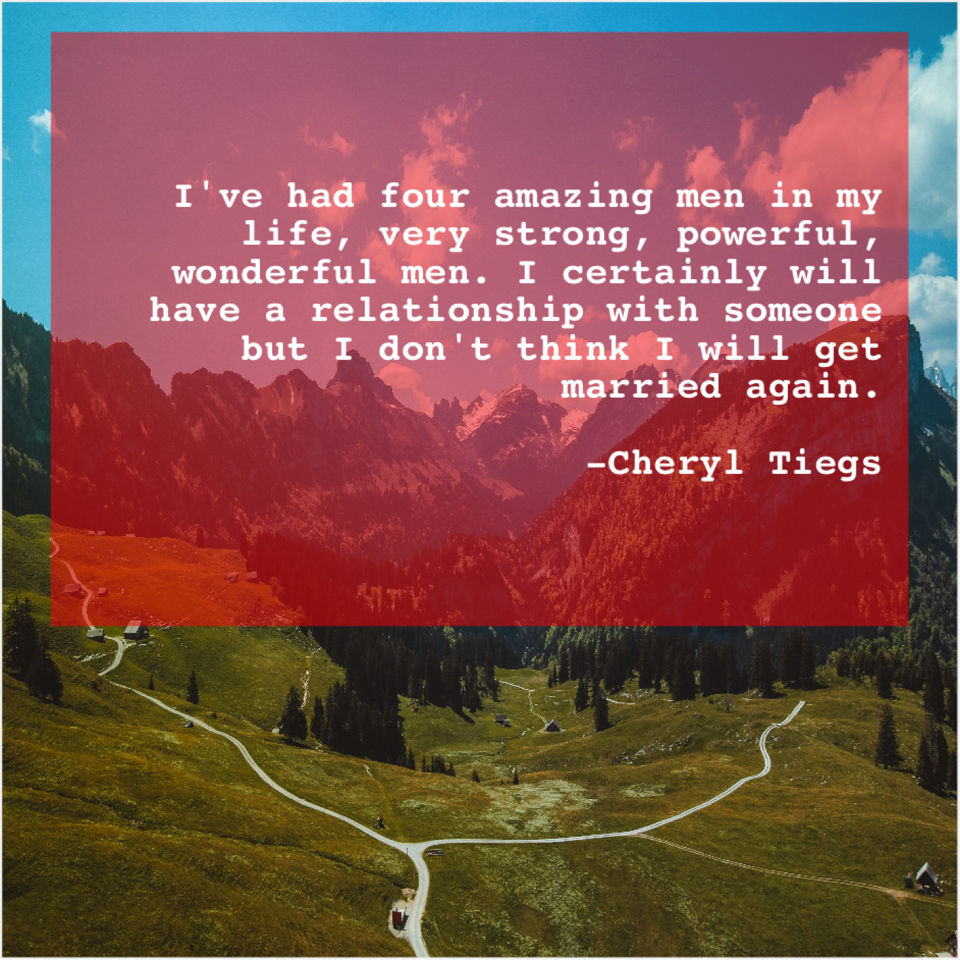 Cheryl Tiegs Cheryl Tiegs – I’ve had four amazing men… May 2, 2019 admin “I’ve had four amazing men in my life, very strong, powerful, wonderful men. I certainly will have a relationship with someone but I don’t think I will get married again.”-Cheryl Tiegs