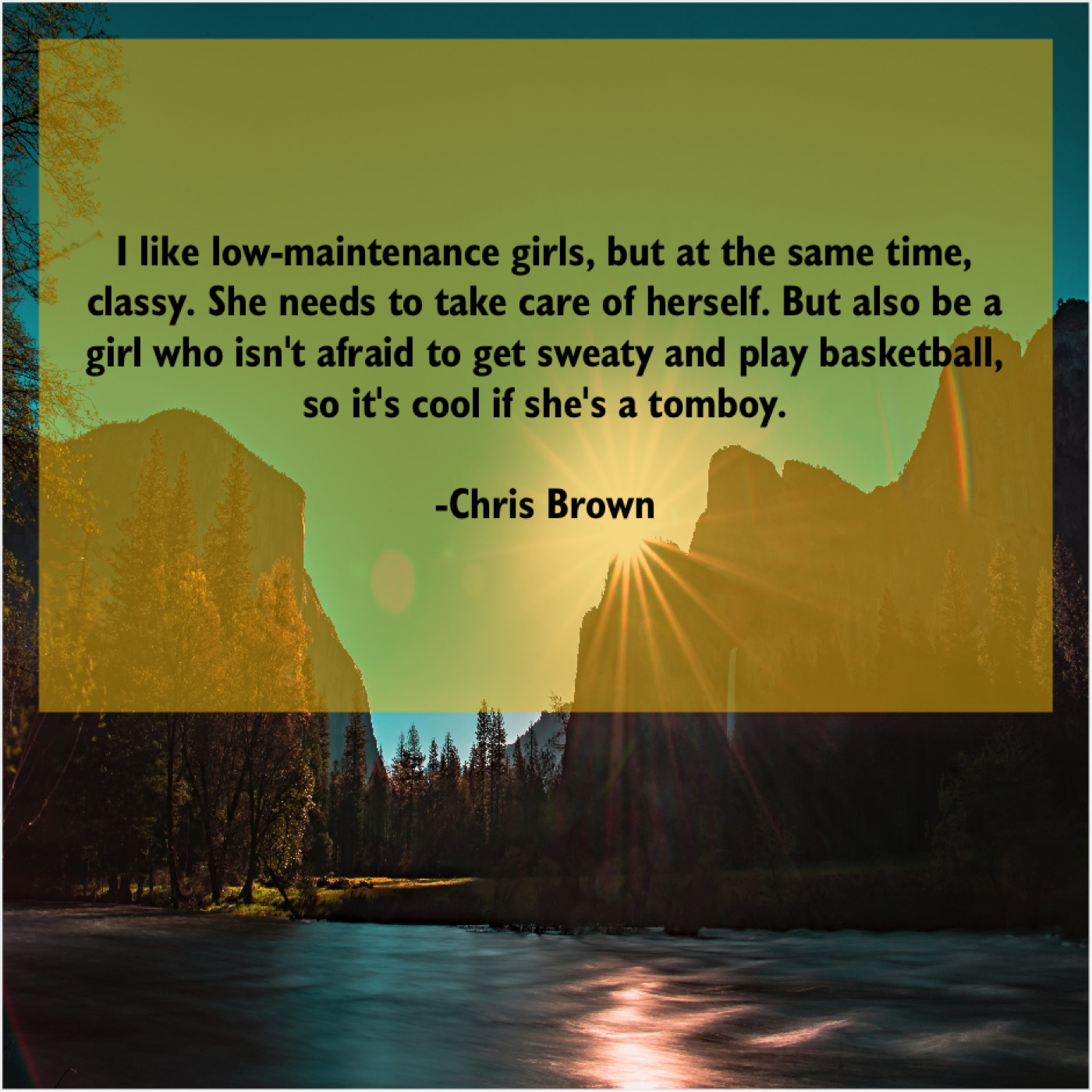 Chris Brown Chris Brown – I like low-maintenance girls… April 7, 2019 admin “I like low-maintenance girls, but at the same time, classy. She needs to take care of herself. But also be a girl who isn’t afraid to get sweaty and play basketball, so it’s cool if she’s a tomboy.”-Chris Brown