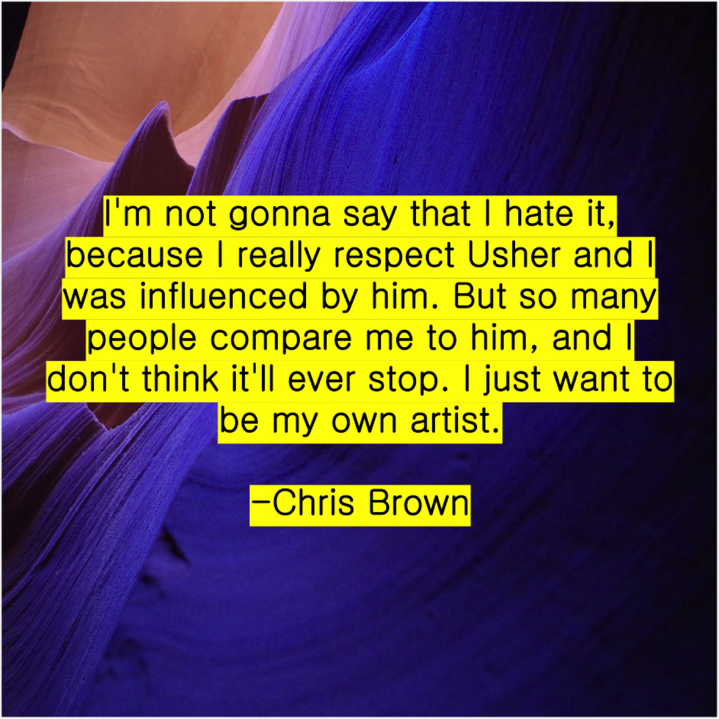 Chris Brown Chris Brown – I’m not gonna say that… August 31, 2019 admin “I’m not gonna say that I hate it, because I really respect Usher and I was influenced by him. But so many people compare me to him, and I don’t think it’ll ever stop. I just want to be my own artist.”-Chris Brown