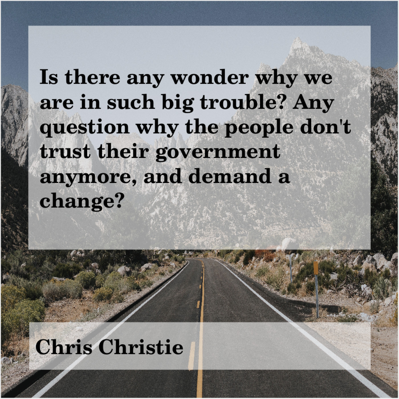 Chris Christie Chris Christie – Is there any wonder why… April 8, 2019 admin “Is there any wonder why we are in such big trouble? Any question why the people don’t trust their government anymore, and demand a change?”-Chris Christie