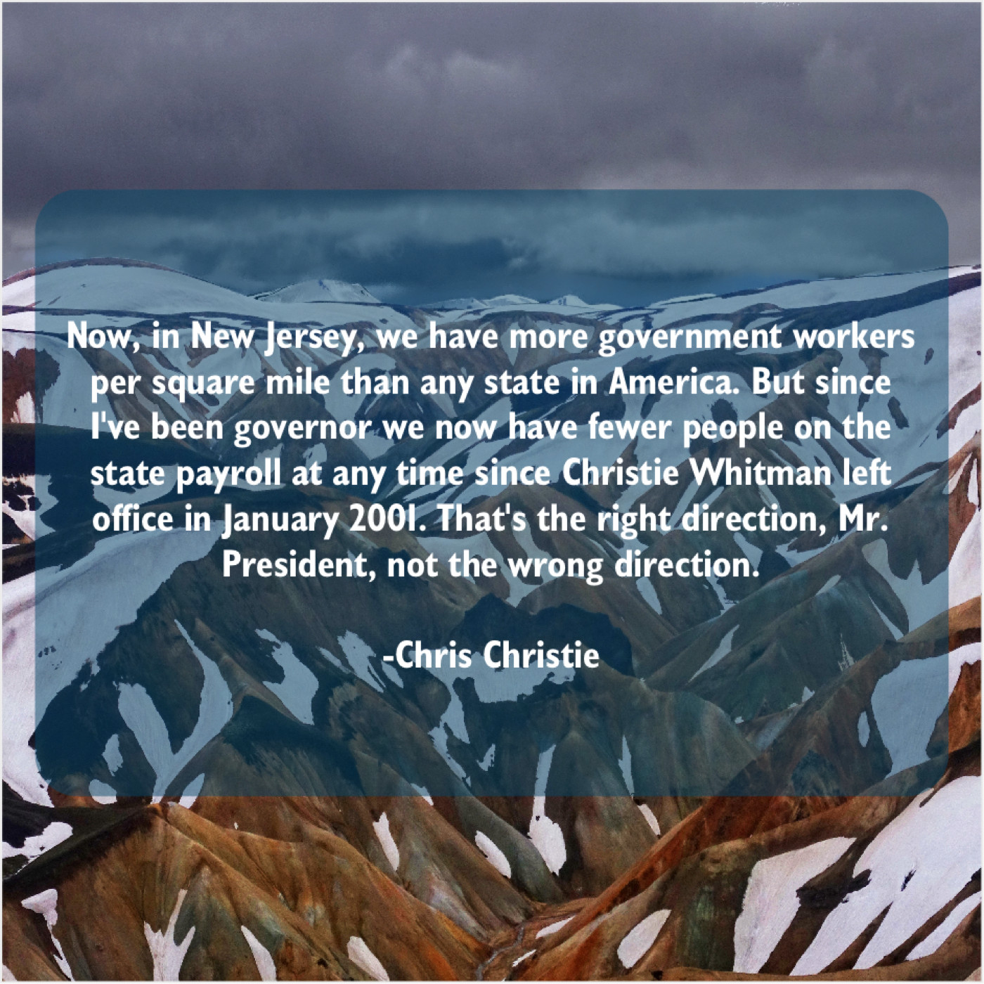 “Now, in New Jersey, we have more government workers per square mile than any state in America. But since I’ve been governor we now have fewer people on the state payroll at any time since Christie Whitman left office in January 2001. That’s the right direction, Mr. President, not the wrong direction.”
