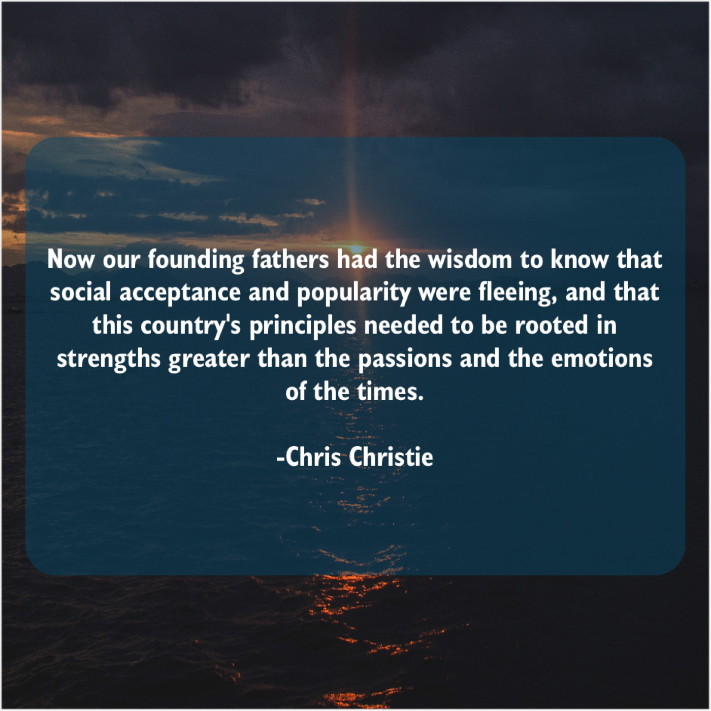 Chris Christie Chris Christie – Now our founding fathers had… September 27, 2019 admin “Now our founding fathers had the wisdom to know that social acceptance and popularity were fleeing, and that this country’s principles needed to be rooted in strengths greater than the passions and the emotions of the times.”-Chris Christie