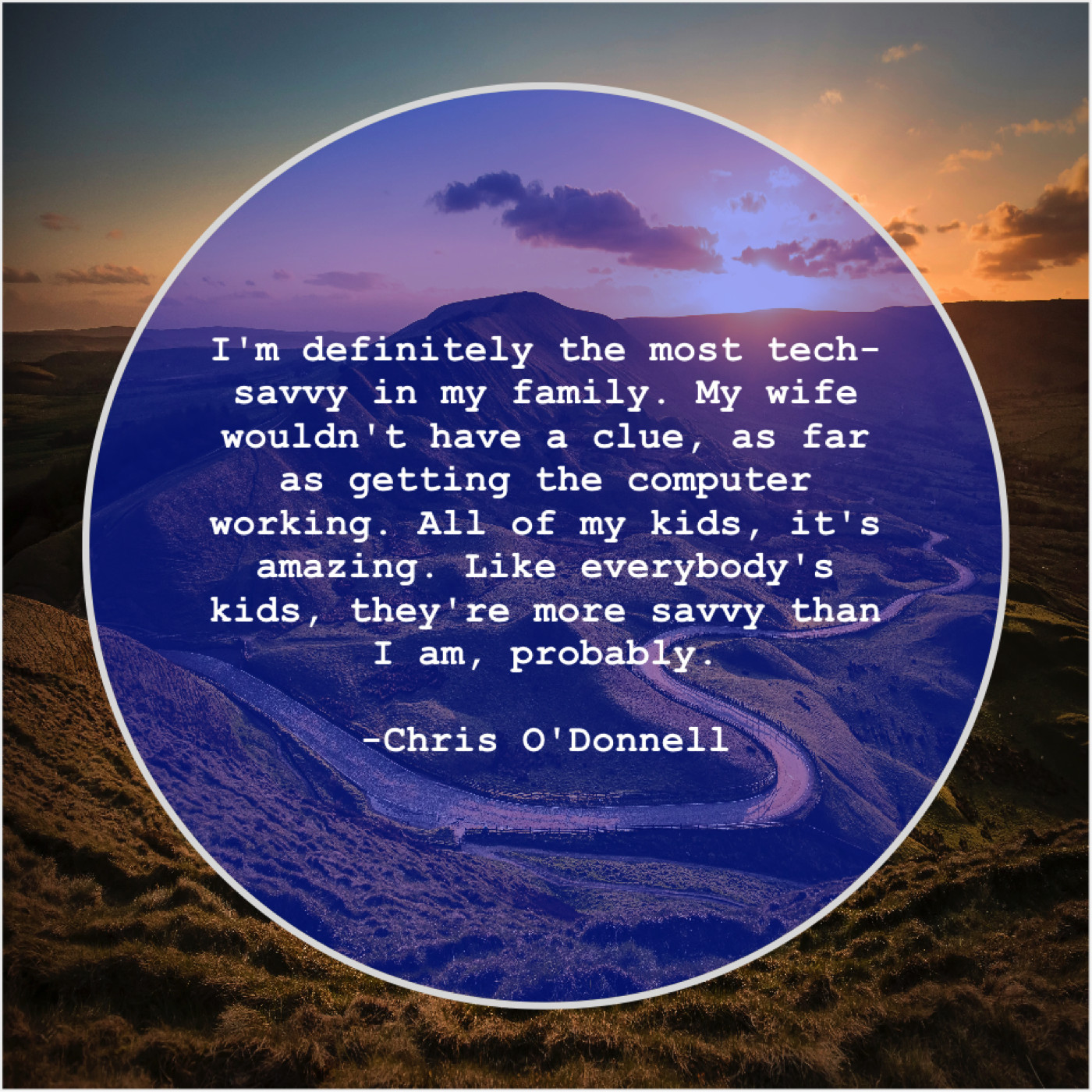 Chris O'Donnell Chris O’Donnell – I’m definitely the most tech… June 14, 2019 admin “I’m definitely the most tech-savvy in my family. My wife wouldn’t have a clue, as far as getting the computer working. All of my kids, it’s amazing. Like everybody’s kids, they’re more savvy than I am, probably.”-Chris O’Donnell