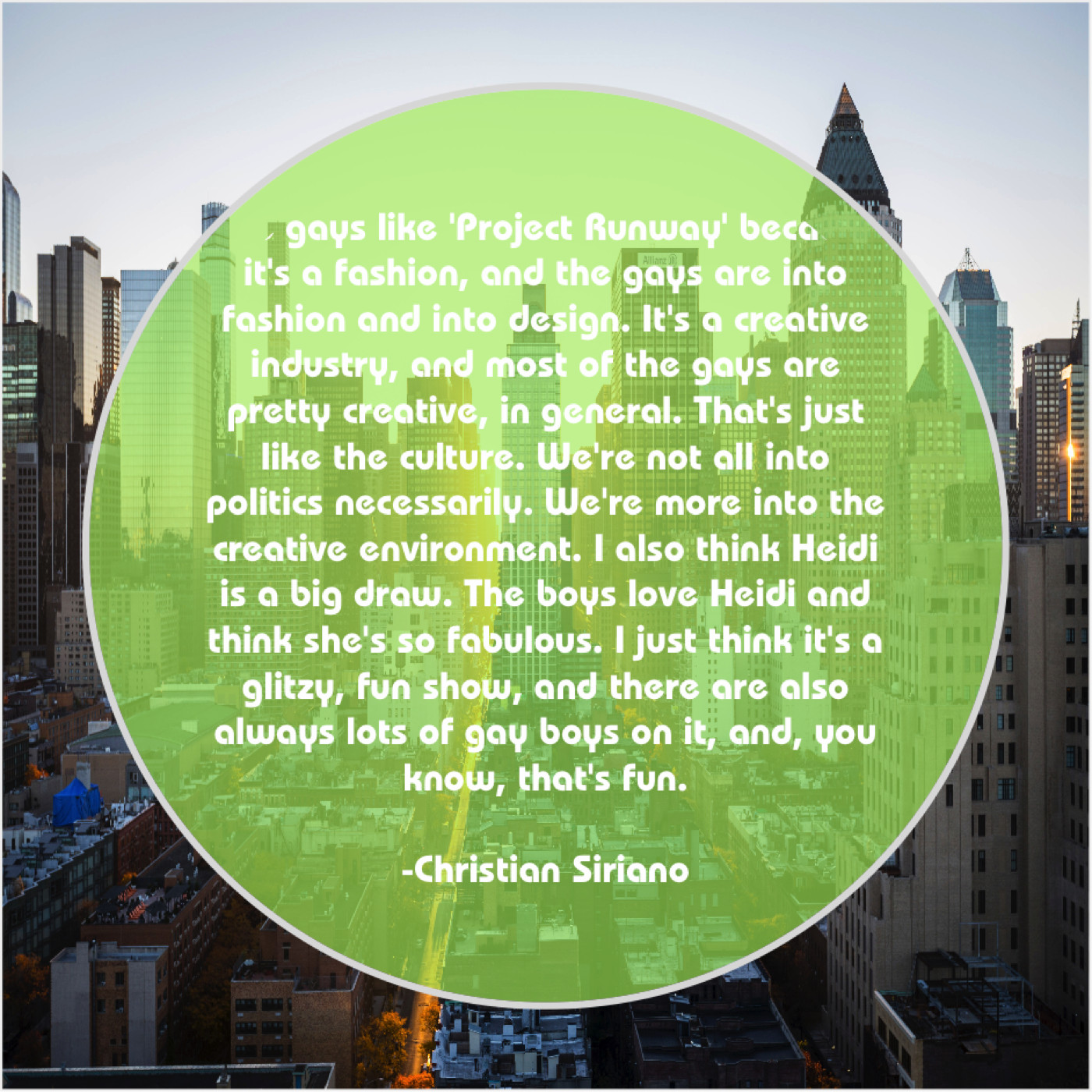 “The gays like ‘Project Runway’ because it’s a fashion, and the gays are into fashion and into design. It’s a creative industry, and most of the gays are pretty creative, in general. That’s just like the culture. We’re not all into politics necessarily. We’re more into the creative environment. I also think Heidi is a big draw. The boys love Heidi and think she’s so fabulous. I just think it’s a glitzy, fun show, and there are also always lots of gay boys on it, and, you know, that’s fun.”