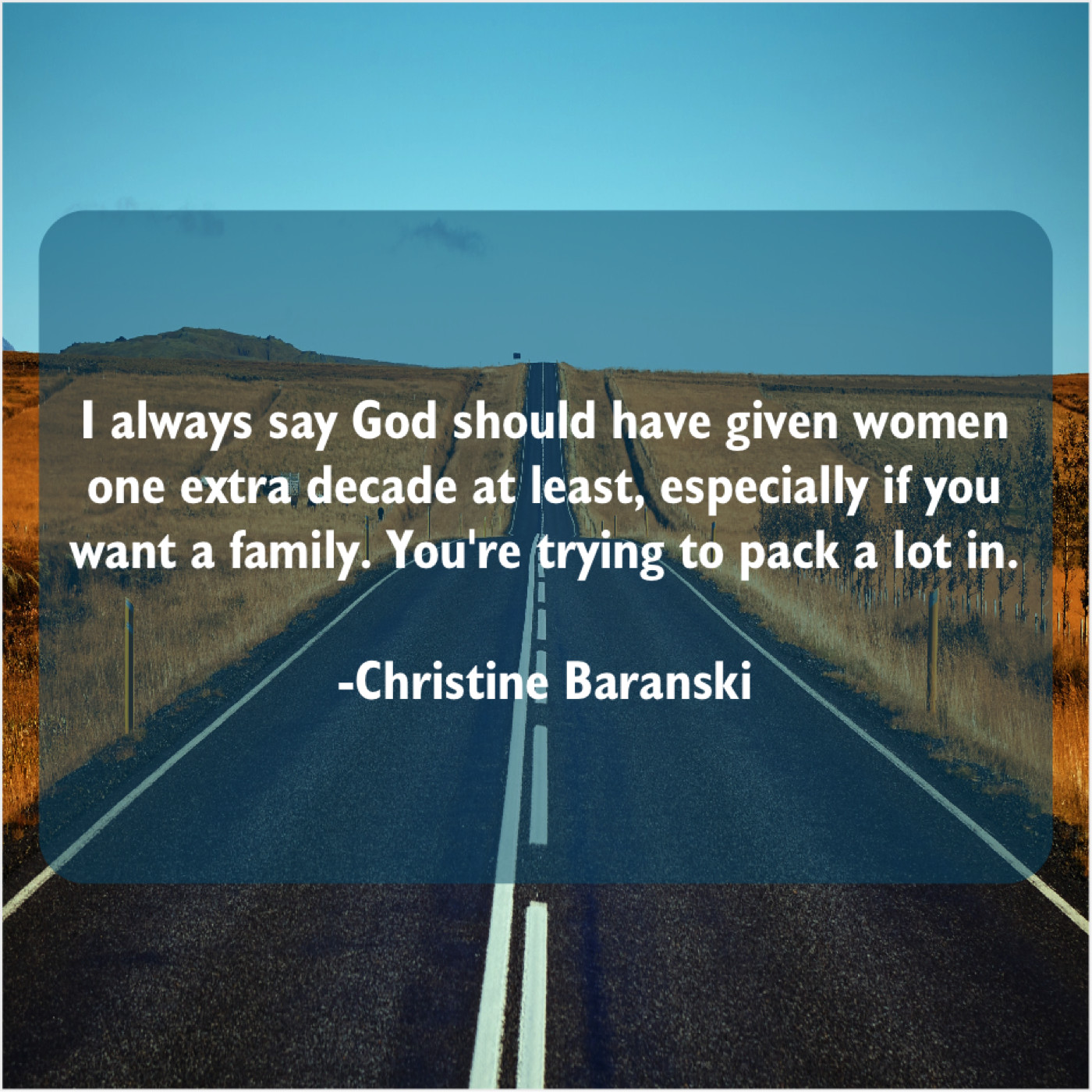 Christine Baranski Christine Baranski – I always say God should… October 30, 2018 admin “I always say God should have given women one extra decade at least, especially if you want a family. You’re trying to pack a lot in.”-Christine Baranski