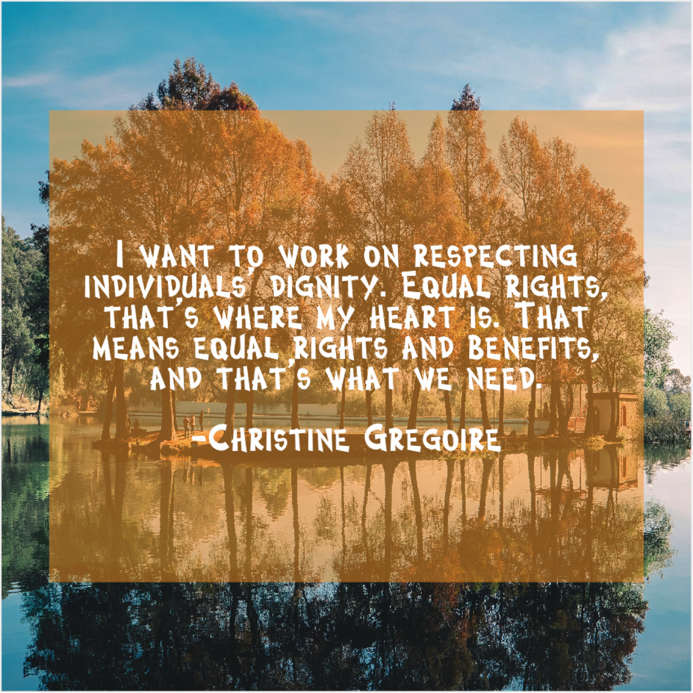 Christine Gregoire Christine Gregoire – I want to work on… June 13, 2019 admin “I want to work on respecting individuals’ dignity. Equal rights, that’s where my heart is. That means equal rights and benefits, and that’s what we need.”-Christine Gregoire