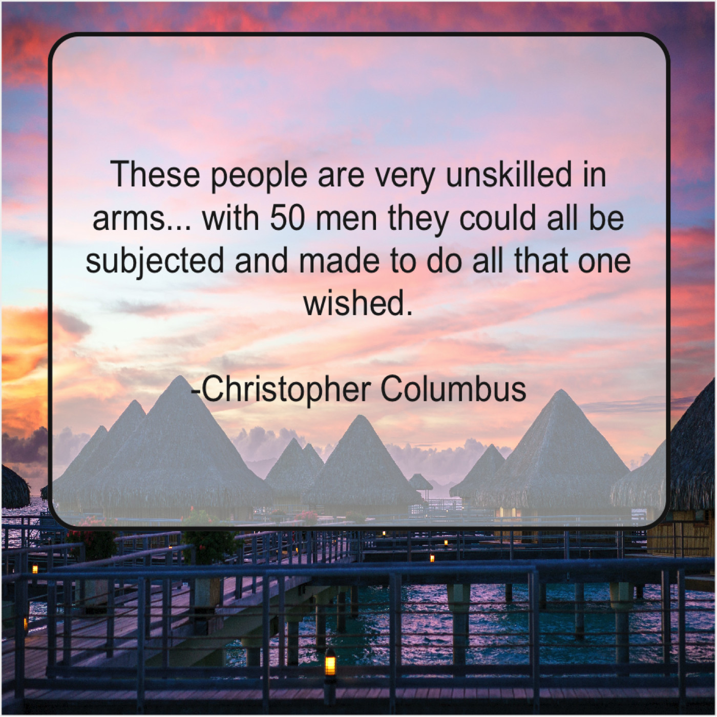 Christopher Columbus Christopher Columbus – These people are very unskilled… January 28, 2019 admin “These people are very unskilled in arms… with 50 men they could all be subjected and made to do all that one wished.”-Christopher Columbus