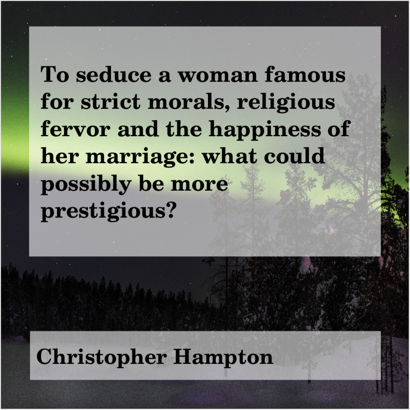 Christopher Hampton Christopher Hampton – To seduce a woman famous… June 18, 2019 admin “To seduce a woman famous for strict morals, religious fervor and the happiness of her marriage: what could possibly be more prestigious?”-Christopher Hampton
