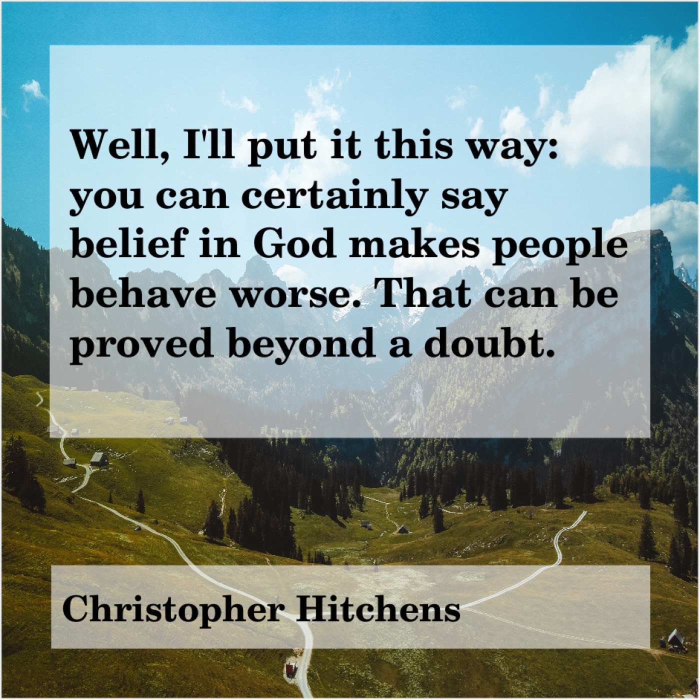 Christopher Hitchens Christopher Hitchens – Well, I’ll put it this… June 9, 2019 admin “Well, I’ll put it this way: you can certainly say belief in God makes people behave worse. That can be proved beyond a doubt.”-Christopher Hitchens