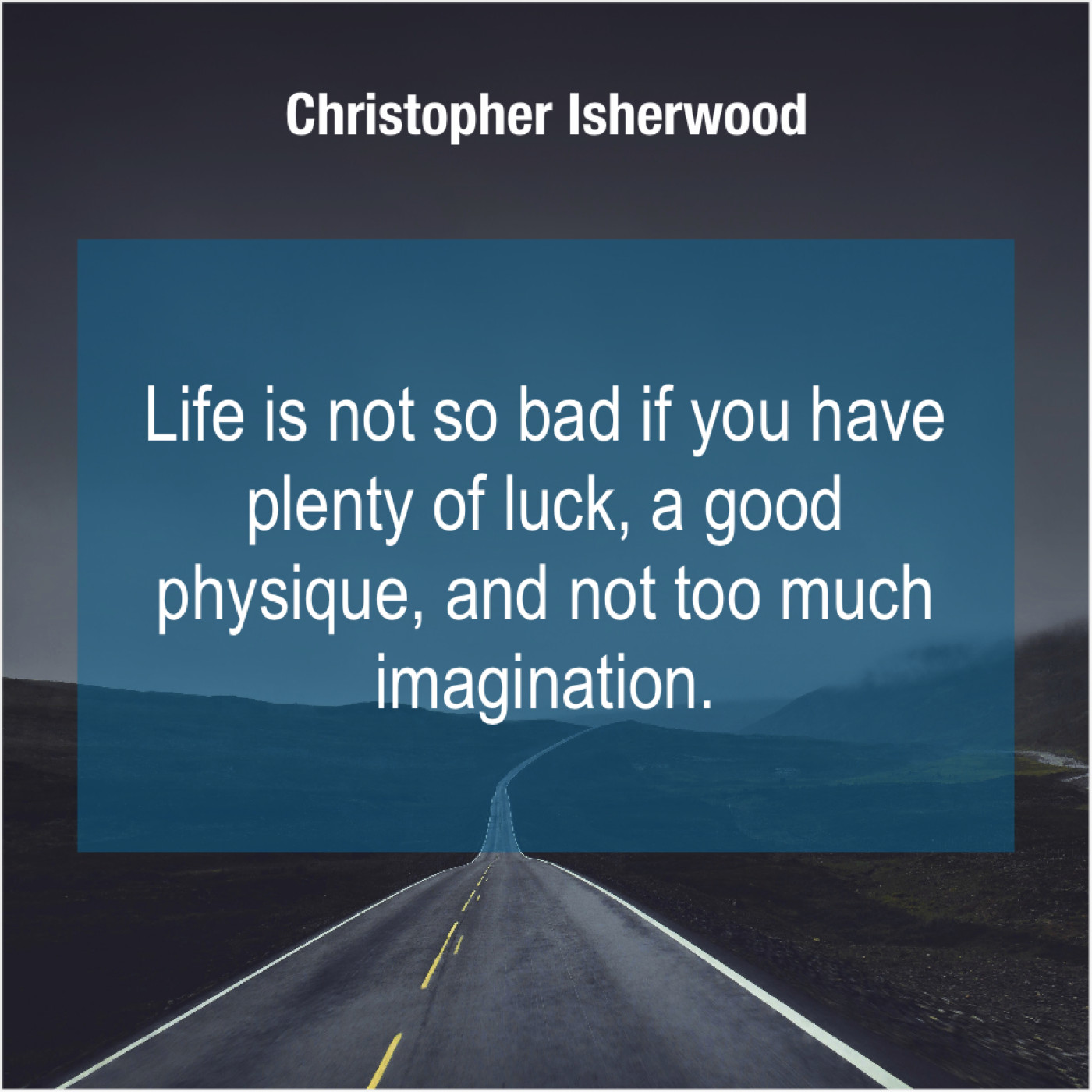 Christopher Isherwood Christopher Isherwood – Life is not so bad… March 23, 2019 admin “Life is not so bad if you have plenty of luck, a good physique, and not too much imagination.”-Christopher Isherwood