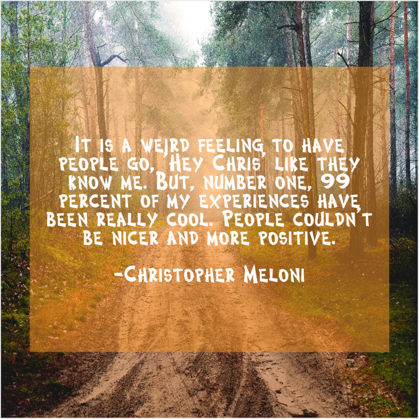 Christopher Meloni Christopher Meloni – It is a weird feeling… February 16, 2019 admin “It is a weird feeling to have people go, ‘Hey Chris’ like they know me. But, number one, 99 percent of my experiences have been really cool. People couldn’t be nicer and more positive.”-Christopher Meloni