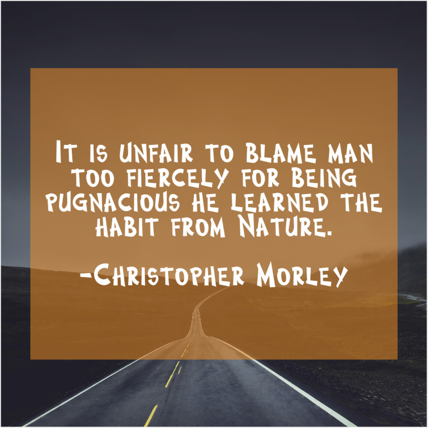 Christopher Morley Christopher Morley – It is unfair to blame… September 14, 2019 admin “It is unfair to blame man too fiercely for being pugnacious he learned the habit from Nature.”-Christopher Morley