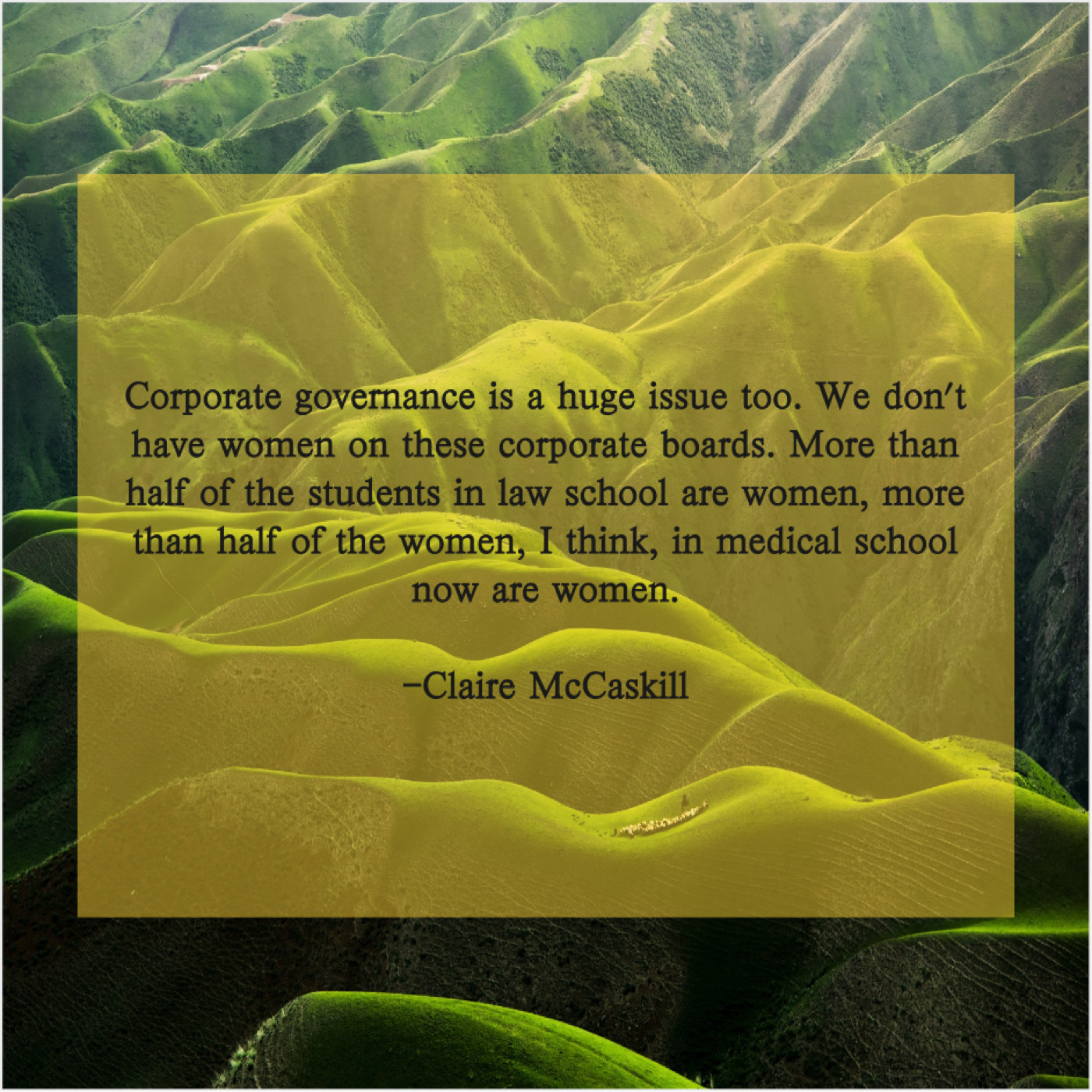 Claire McCaskill Claire McCaskill – Corporate governance is a huge… January 15, 2019 admin “Corporate governance is a huge issue too. We don’t have women on these corporate boards. More than half of the students in law school are women, more than half of the women, I think, in medical school now are women.”-Claire McCaskill