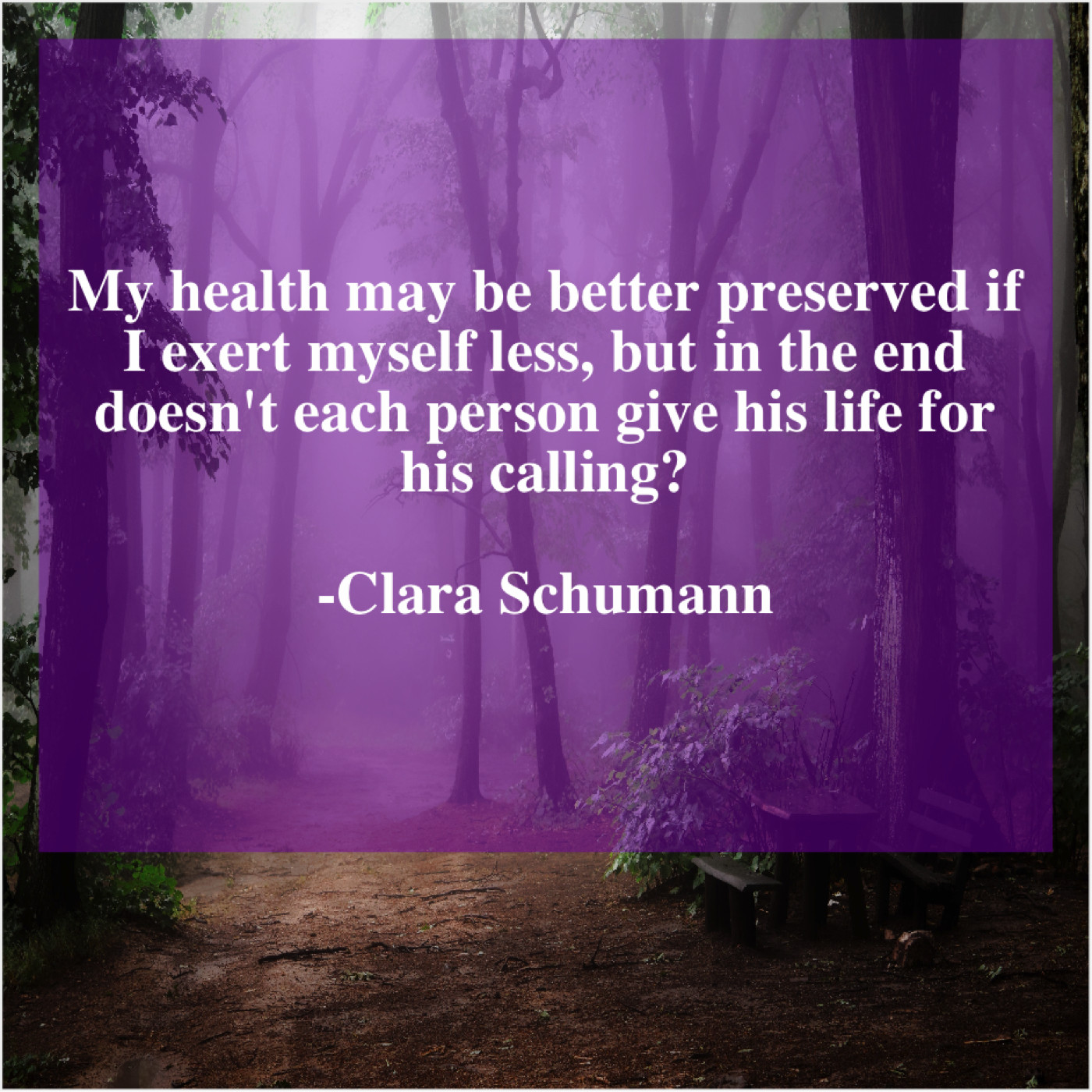 Clara Schumann Clara Schumann – My health may be better… September 1, 2019 admin “My health may be better preserved if I exert myself less, but in the end doesn’t each person give his life for his calling?”-Clara Schumann
