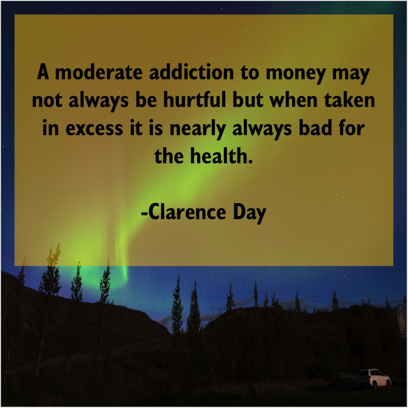 Clarence Day Clarence Day – A moderate addiction to money… February 5, 2019 admin “A moderate addiction to money may not always be hurtful but when taken in excess it is nearly always bad for the health.”-Clarence Day