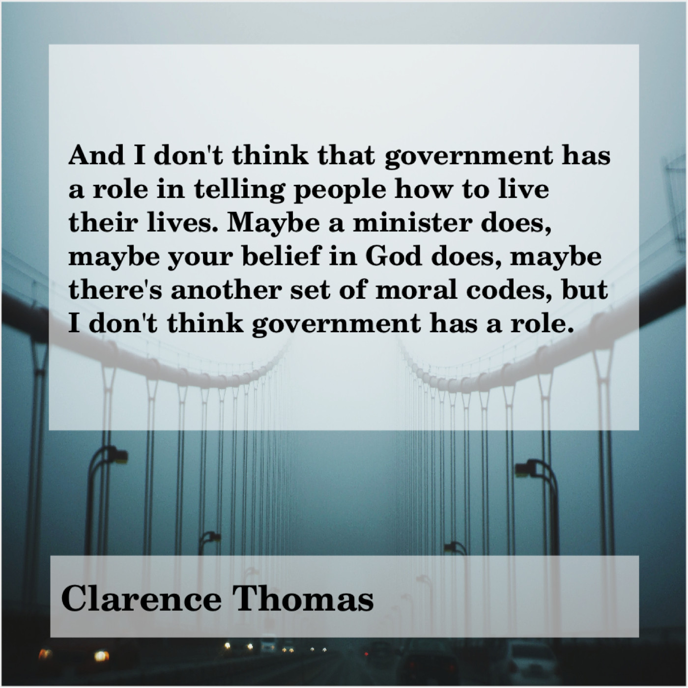 Clarence Thomas Clarence Thomas – And I don’t think that… October 16, 2019 admin “And I don’t think that government has a role in telling people how to live their lives. Maybe a minister does, maybe your belief in God does, maybe there’s another set of moral codes, but I don’t think government has a role.”-Clarence Thomas