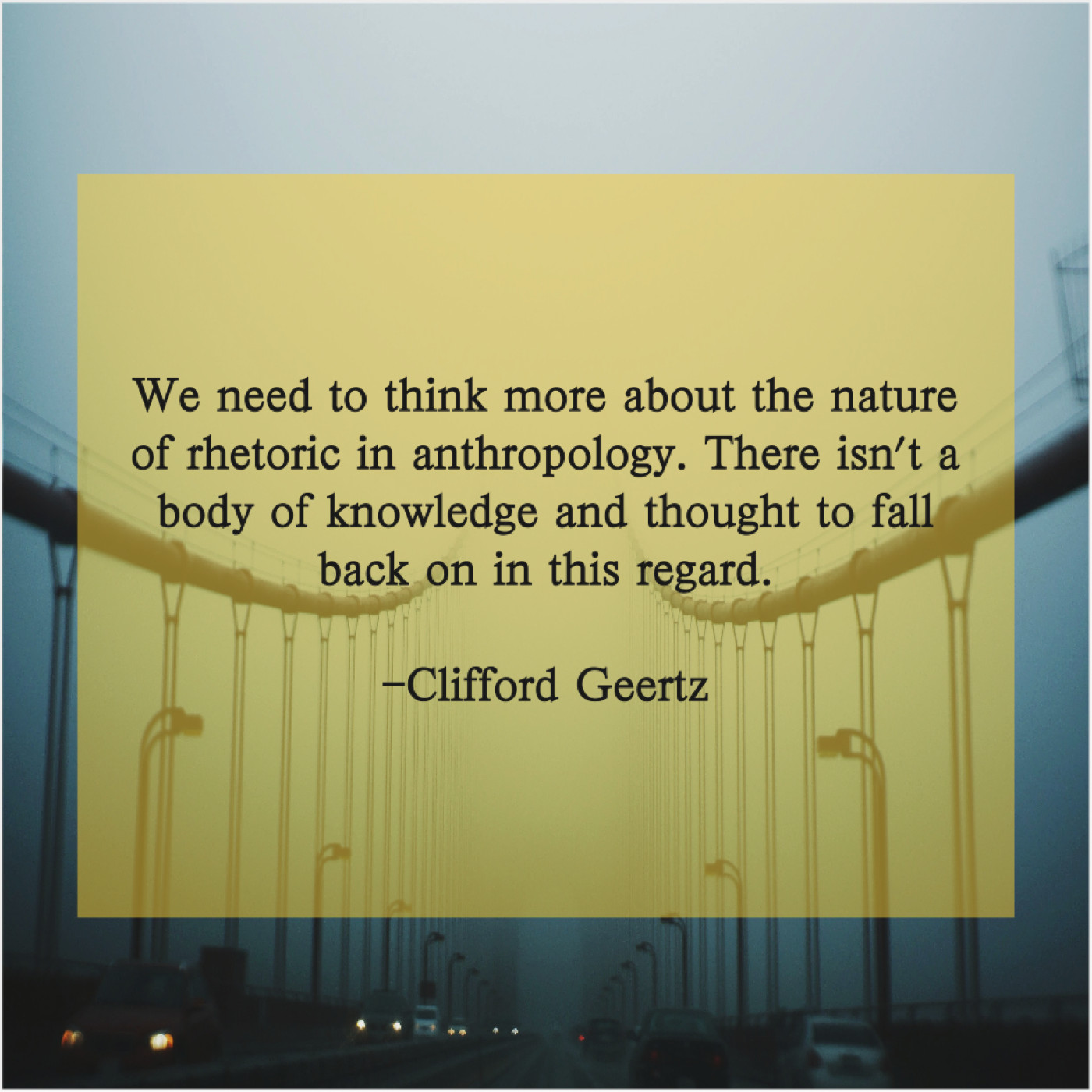 Clifford Geertz Clifford Geertz – We need to think more… April 8, 2019 admin “We need to think more about the nature of rhetoric in anthropology. There isn’t a body of knowledge and thought to fall back on in this regard.”-Clifford Geertz