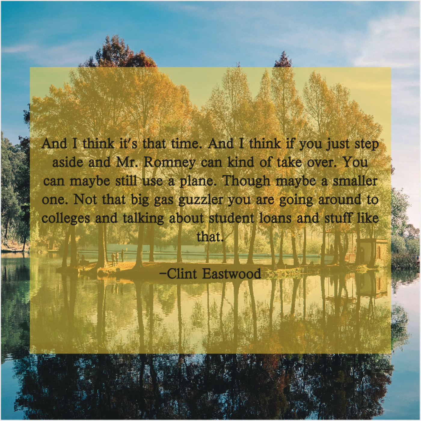 “And I think it’s that time. And I think if you just step aside and Mr. Romney can kind of take over. You can maybe still use a plane. Though maybe a smaller one. Not that big gas guzzler you are going around to colleges and talking about student loans and stuff like that.”