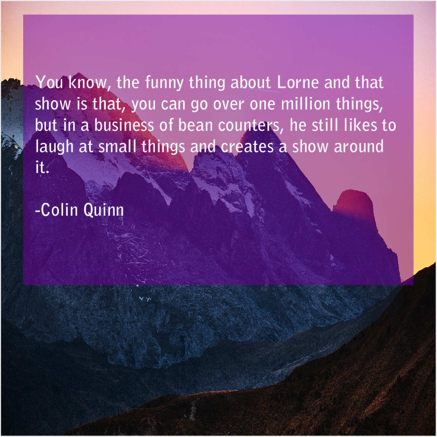 Colin Quinn Colin Quinn – You know, the funny thing… November 14, 2018 admin “You know, the funny thing about Lorne and that show is that, you can go over one million things, but in a business of bean counters, he still likes to laugh at small things and creates a show around it.”-Colin Quinn