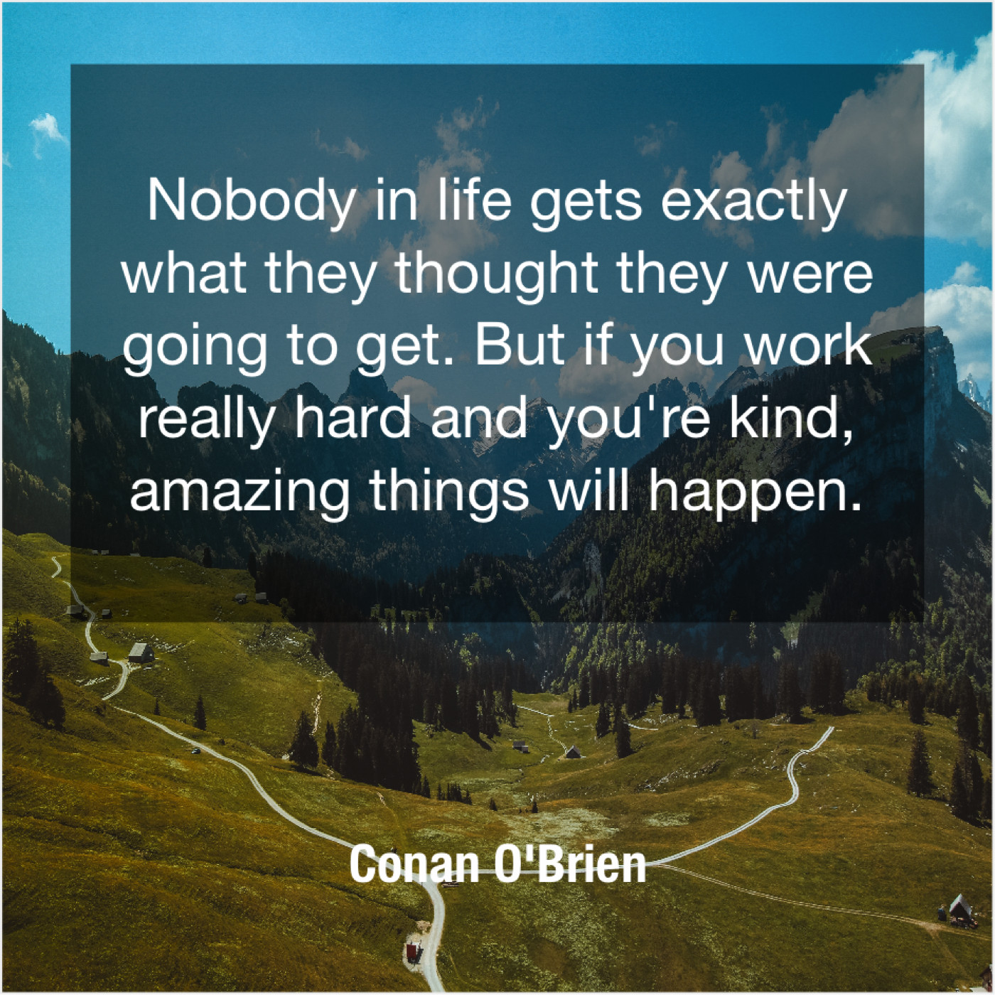 Conan O'Brien Conan O’Brien – Nobody in life gets exactly… May 22, 2019 admin “Nobody in life gets exactly what they thought they were going to get. But if you work really hard and you’re kind, amazing things will happen.”-Conan O’Brien