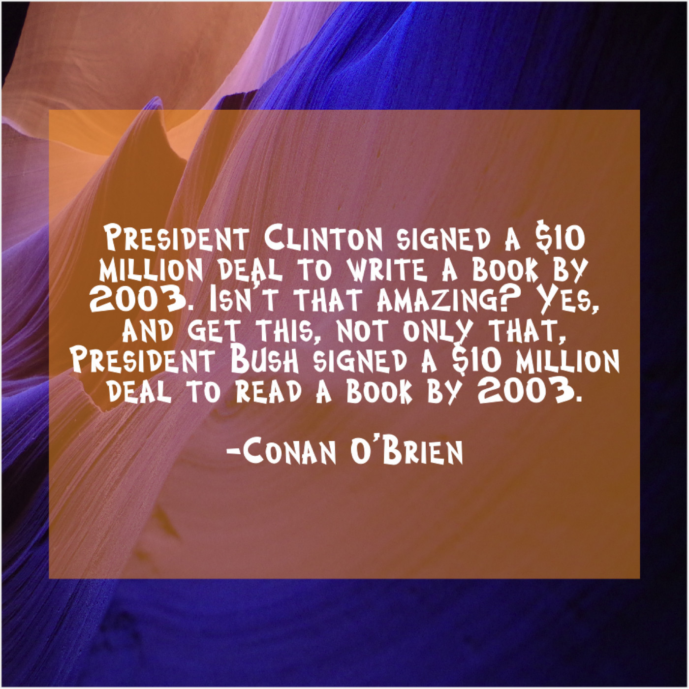 Conan O'Brien Conan O’Brien – President Clinton signed a $10… March 27, 2019 admin “President Clinton signed a $10 million deal to write a book by 2003. Isn’t that amazing? Yes, and get this, not only that, President Bush signed a $10 million deal to read a book by 2003.”-Conan O’Brien