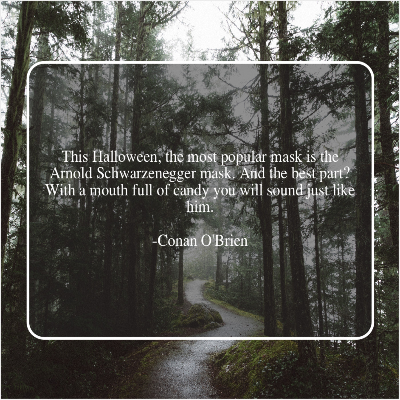 Conan O'Brien Conan O’Brien – This Halloween, the most popular… April 28, 2019 admin “This Halloween, the most popular mask is the Arnold Schwarzenegger mask. And the best part? With a mouth full of candy you will sound just like him.”-Conan O’Brien