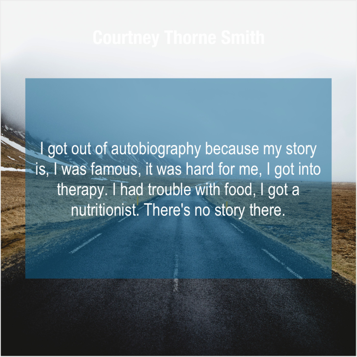 Courtney Thorne Smith Courtney Thorne Smith – I got out of autobiography… November 24, 2018 admin “I got out of autobiography because my story is, I was famous, it was hard for me, I got into therapy. I had trouble with food, I got a nutritionist. There’s no story there.”-Courtney Thorne Smith
