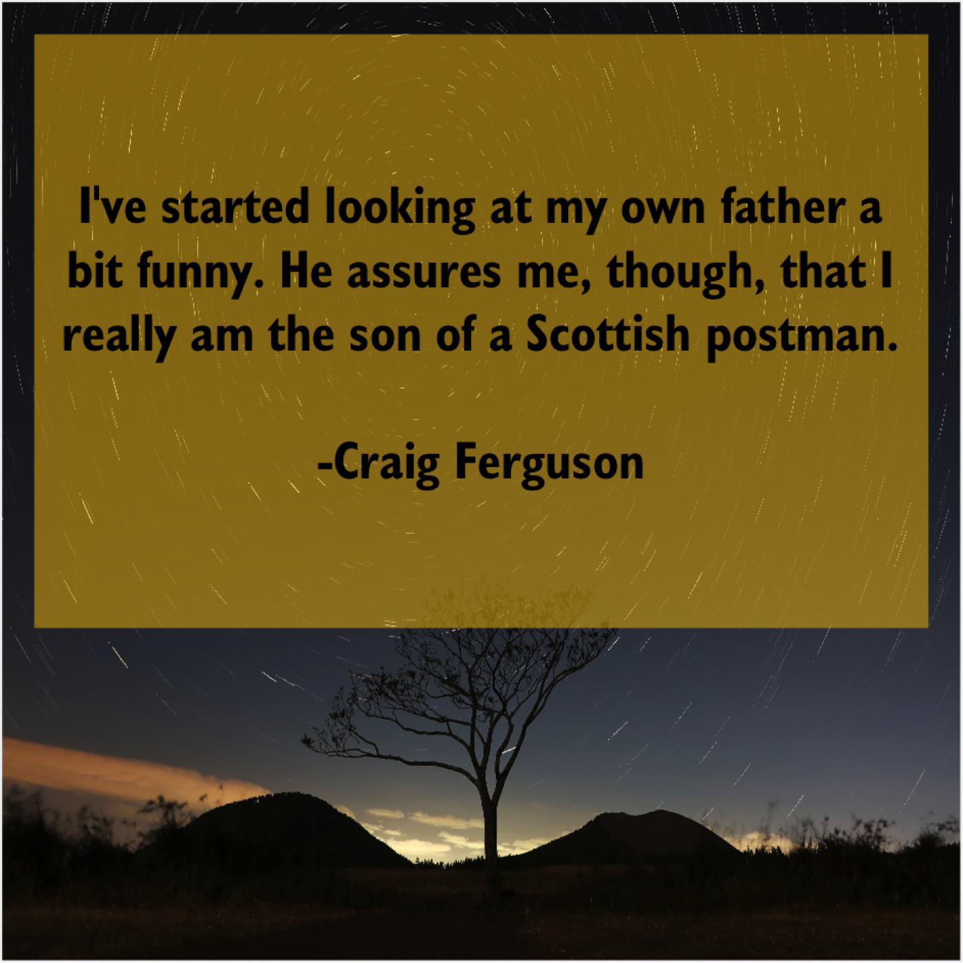 Craig Ferguson Craig Ferguson – I’ve started looking at my… October 18, 2019 admin “I’ve started looking at my own father a bit funny. He assures me, though, that I really am the son of a Scottish postman.”-Craig Ferguson