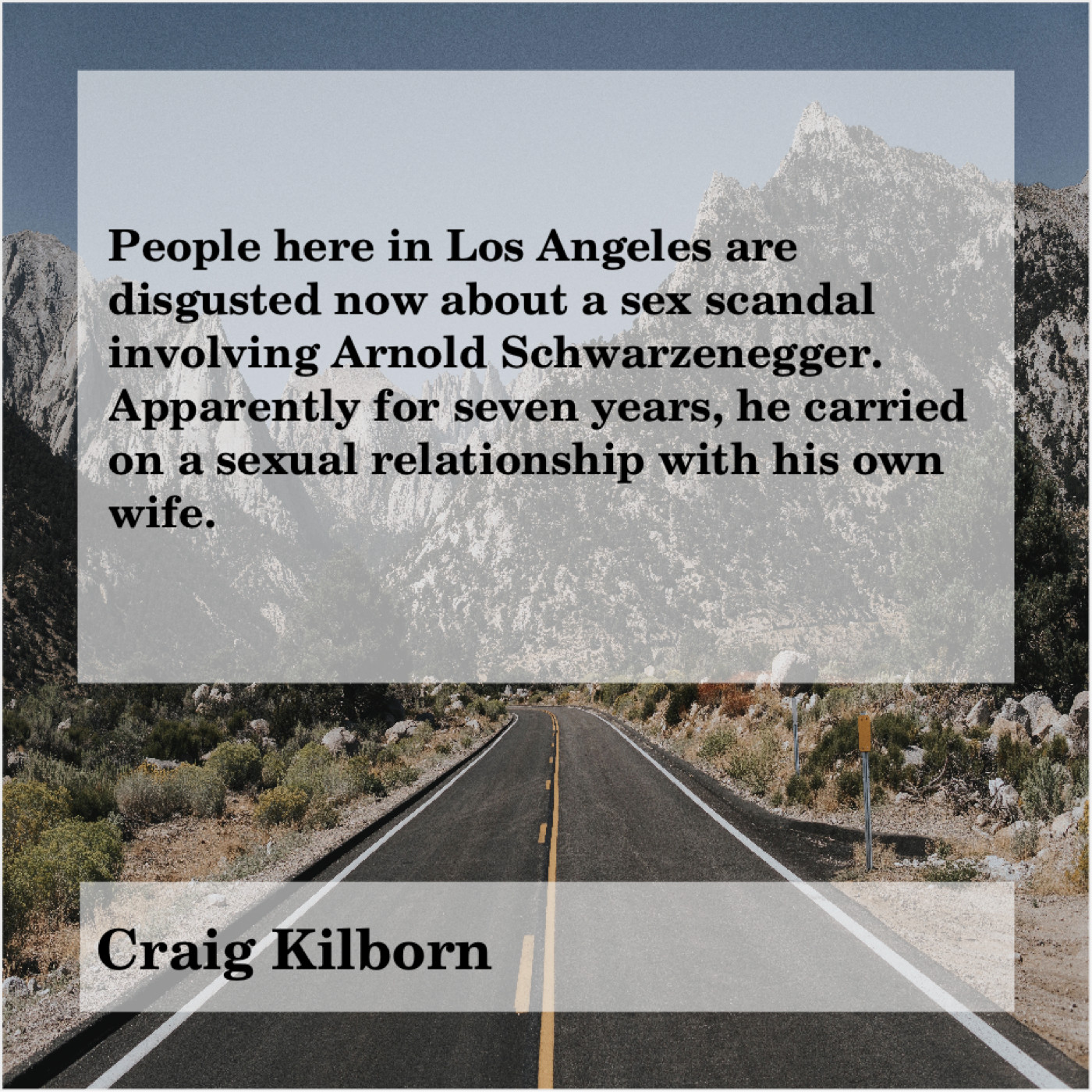 Craig Kilborn Craig Kilborn – People here in Los Angeles… December 12, 2018 admin “People here in Los Angeles are disgusted now about a sex scandal involving Arnold Schwarzenegger. Apparently for seven years, he carried on a sexual relationship with his own wife.”-Craig Kilborn