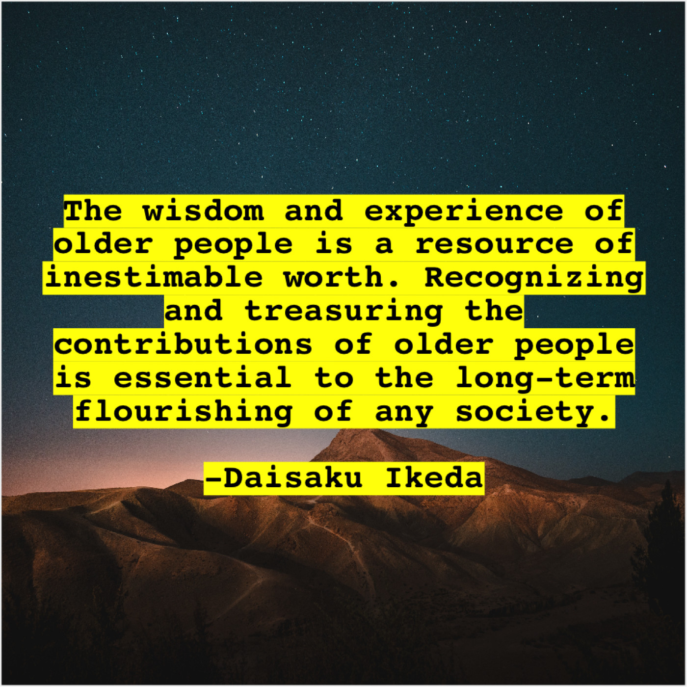 Daisaku Ikeda Daisaku Ikeda – The wisdom and experience of… March 25, 2019 admin “The wisdom and experience of older people is a resource of inestimable worth. Recognizing and treasuring the contributions of older people is essential to the long-term flourishing of any society.”-Daisaku Ikeda
