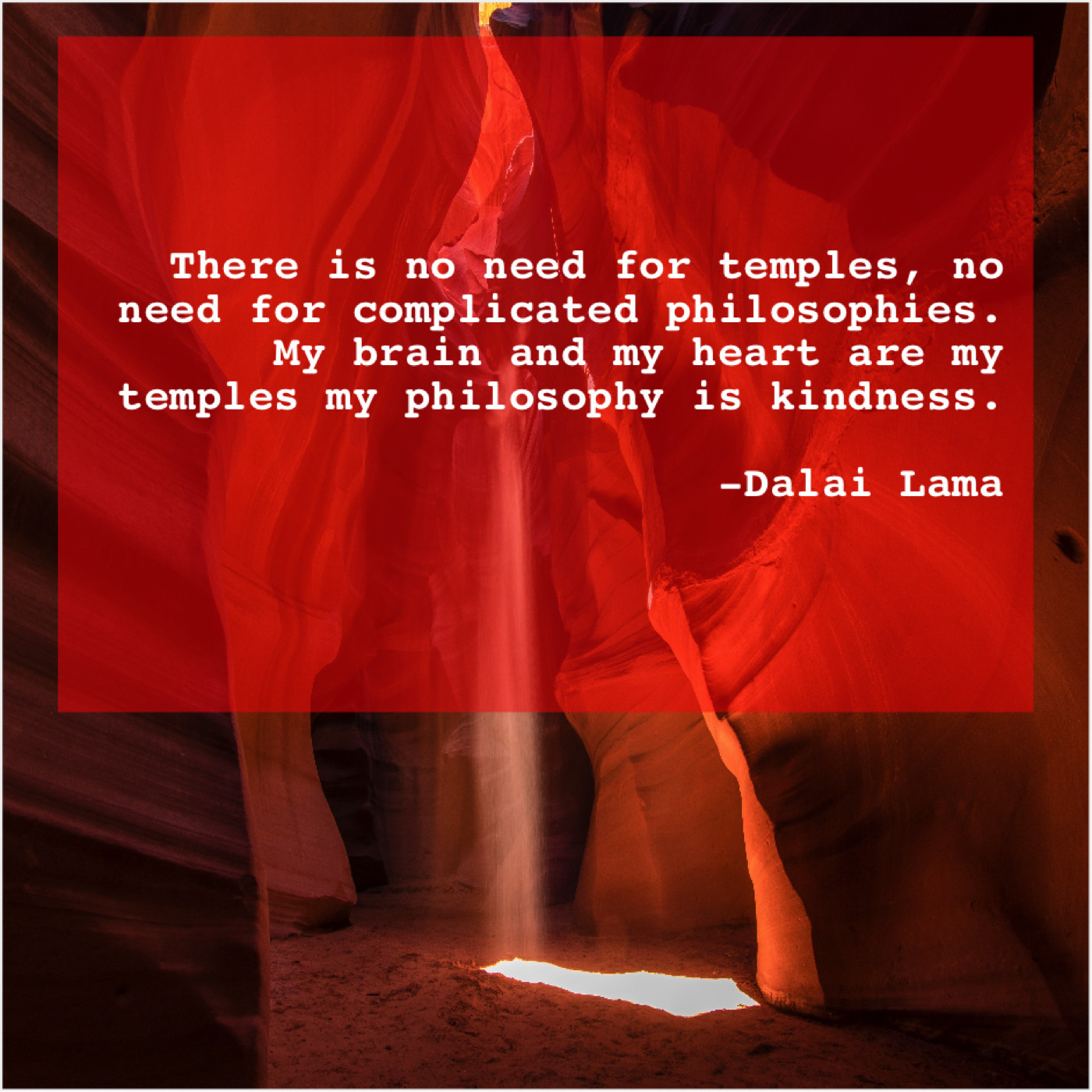 Dalai Lama Dalai Lama – There is no need for… July 9, 2019 admin “There is no need for temples, no need for complicated philosophies. My brain and my heart are my temples my philosophy is kindness.”-Dalai Lama