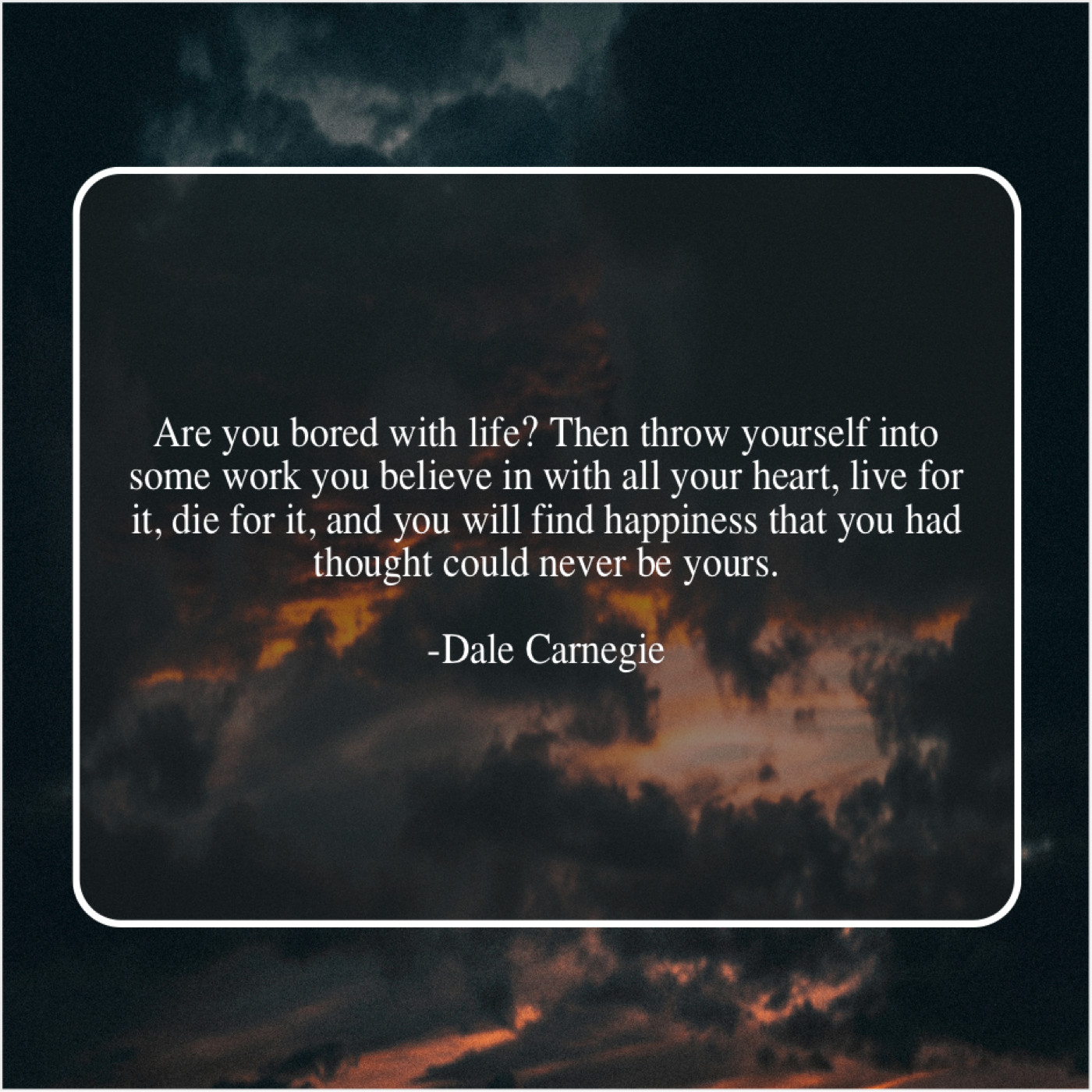Dale Carnegie Dale Carnegie – Are you bored with life… June 26, 2019 admin “Are you bored with life? Then throw yourself into some work you believe in with all your heart, live for it, die for it, and you will find happiness that you had thought could never be yours.”-Dale Carnegie