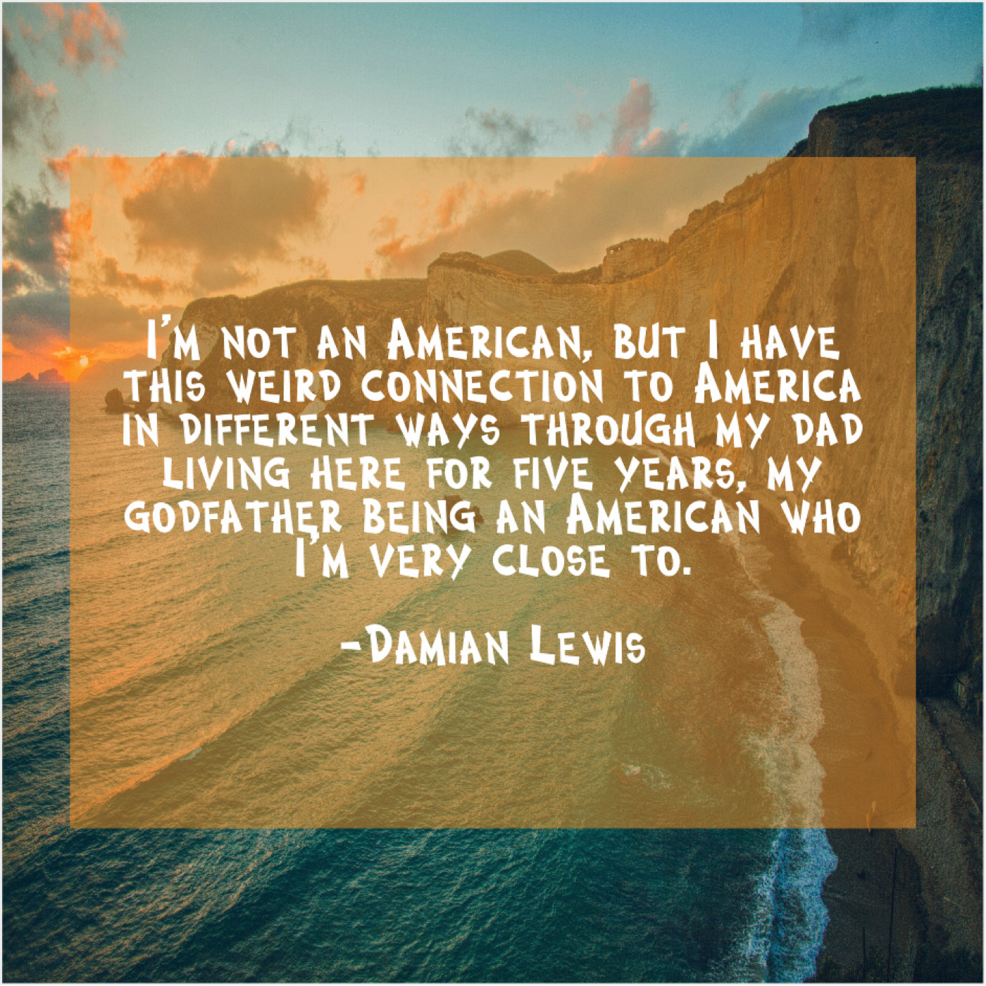 Damian Lewis Damian Lewis – I’m not an American, but… December 3, 2018 admin “I’m not an American, but I have this weird connection to America in different ways through my dad living here for five years, my godfather being an American who I’m very close to.”-Damian Lewis