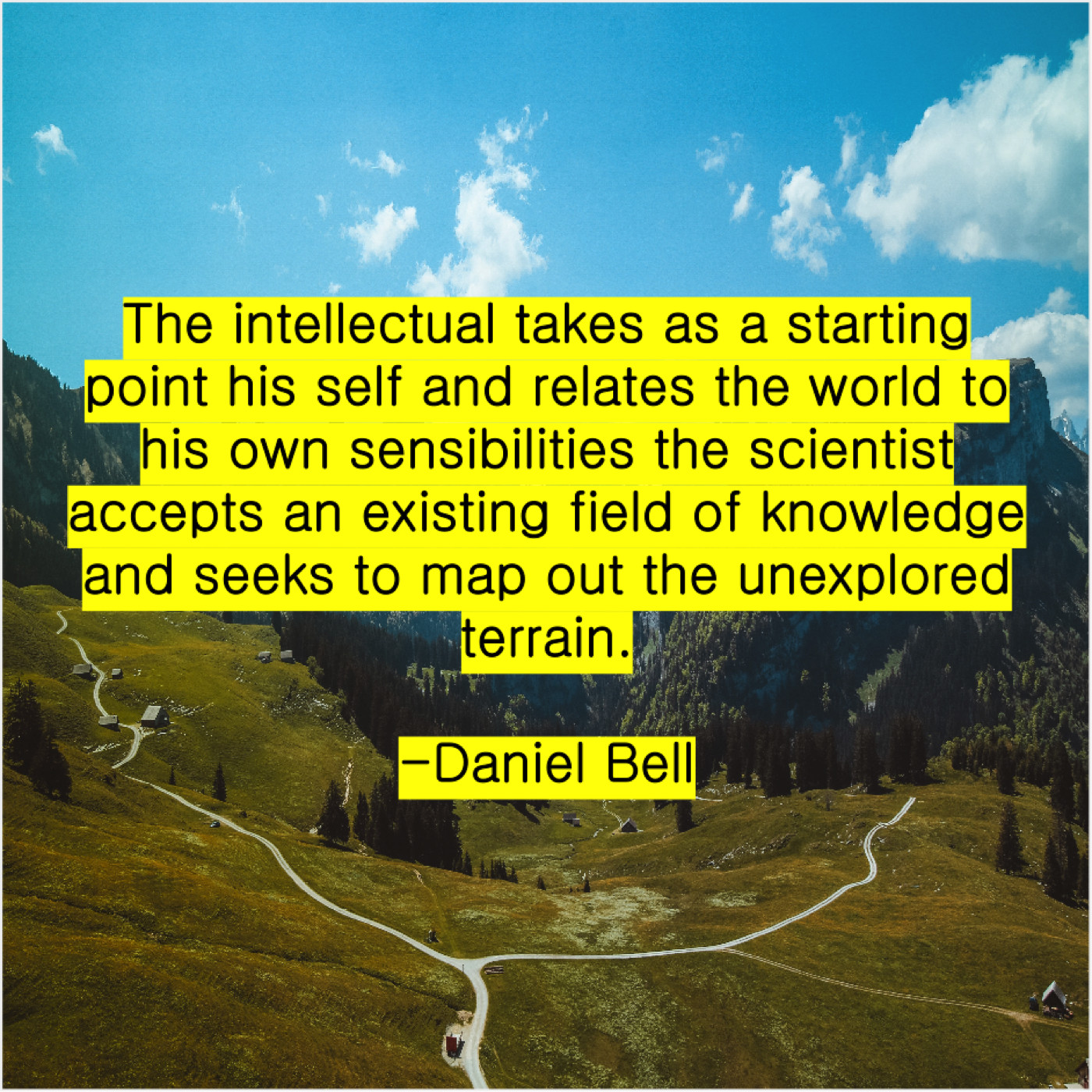 Daniel Bell Daniel Bell – The intellectual takes as a… June 9, 2019 admin “The intellectual takes as a starting point his self and relates the world to his own sensibilities the scientist accepts an existing field of knowledge and seeks to map out the unexplored terrain.”-Daniel Bell