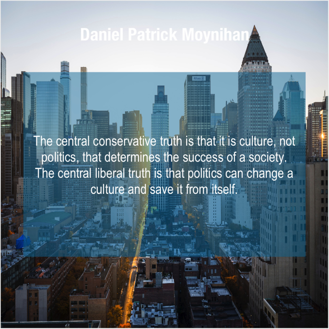 Daniel Patrick Moynihan Daniel Patrick Moynihan – The central conservative truth is… April 10, 2019 admin “The central conservative truth is that it is culture, not politics, that determines the success of a society. The central liberal truth is that politics can change a culture and save it from itself.”-Daniel Patrick Moynihan