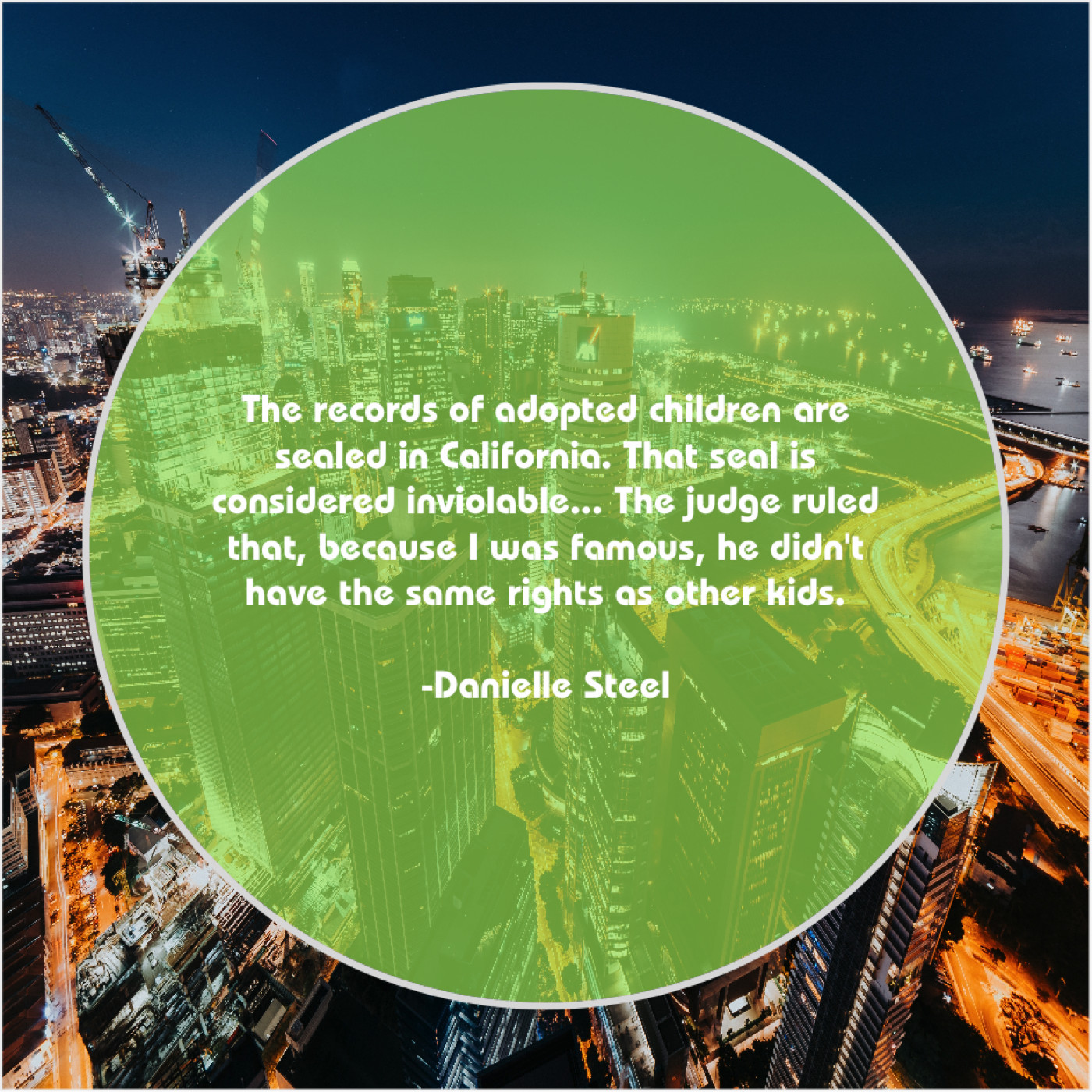 Danielle Steel Danielle Steel – The records of adopted children… July 27, 2019 admin “The records of adopted children are sealed in California. That seal is considered inviolable… The judge ruled that, because I was famous, he didn’t have the same rights as other kids.”-Danielle Steel