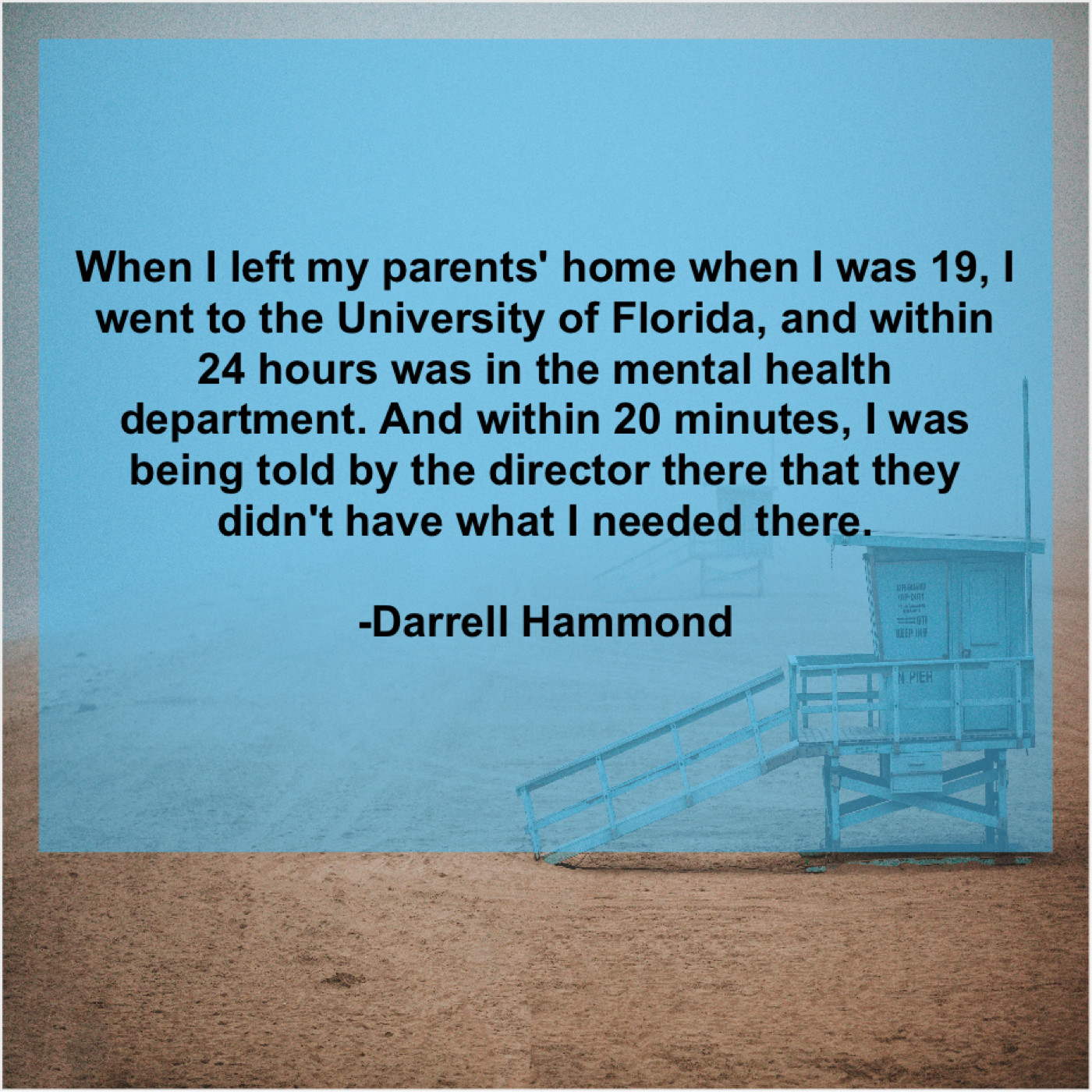 “When I left my parents’ home when I was 19, I went to the University of Florida, and within 24 hours was in the mental health department. And within 20 minutes, I was being told by the director there that they didn’t have what I needed there.”