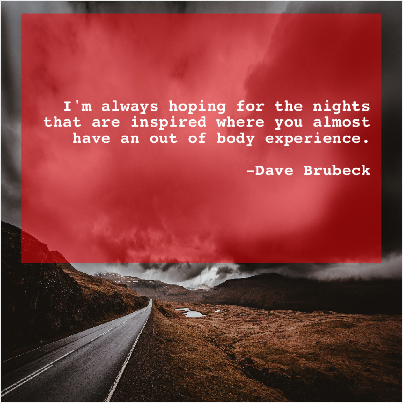 Dave Brubeck Dave Brubeck – I’m always hoping for the… January 25, 2019 admin “I’m always hoping for the nights that are inspired where you almost have an out of body experience.”-Dave Brubeck