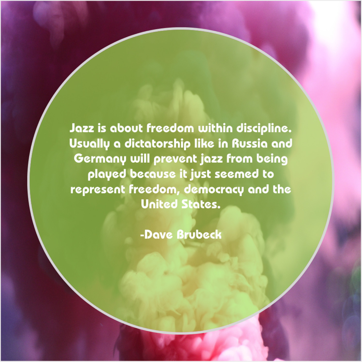 Dave Brubeck Dave Brubeck – Jazz is about freedom within… May 2, 2019 admin “Jazz is about freedom within discipline. Usually a dictatorship like in Russia and Germany will prevent jazz from being played because it just seemed to represent freedom, democracy and the United States.”-Dave Brubeck