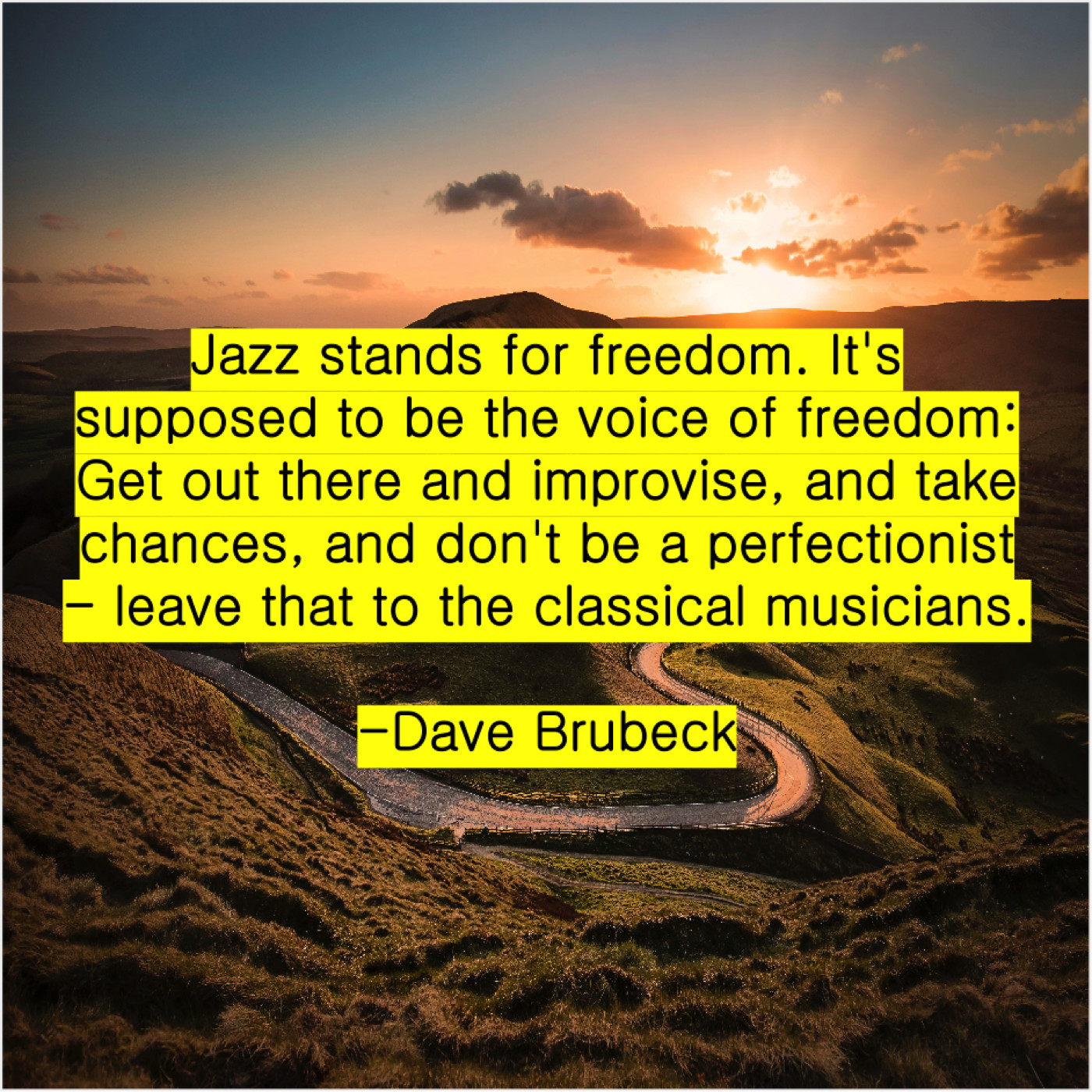 Dave Brubeck Dave Brubeck – Jazz stands for freedom. It’s… April 9, 2019 admin “Jazz stands for freedom. It’s supposed to be the voice of freedom: Get out there and improvise, and take chances, and don’t be a perfectionist – leave that to the classical musicians.”-Dave Brubeck