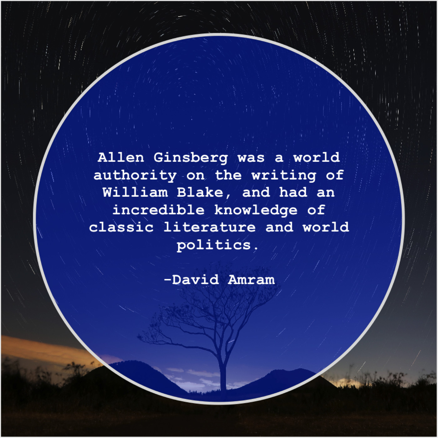 David Amram David Amram – Allen Ginsberg was a world… April 21, 2019 admin “Allen Ginsberg was a world authority on the writing of William Blake, and had an incredible knowledge of classic literature and world politics.”-David Amram