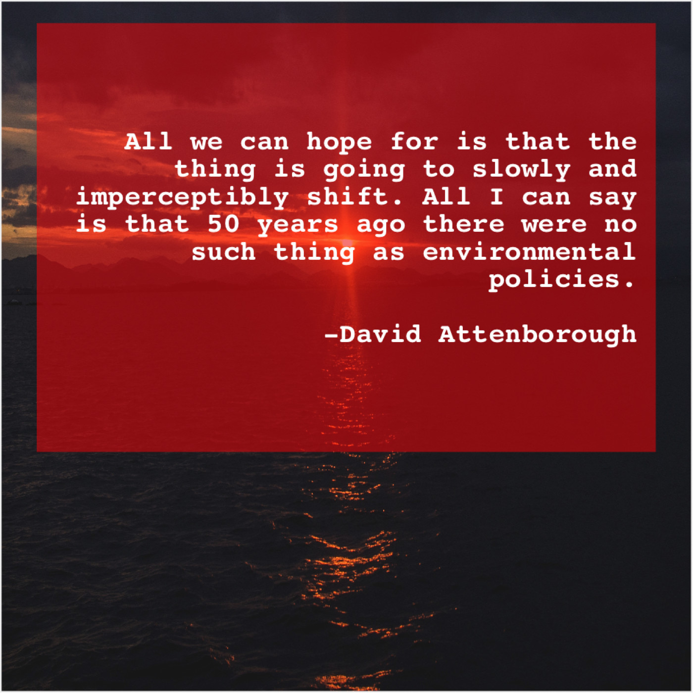David Attenborough David Attenborough – All we can hope for… November 14, 2018 admin “All we can hope for is that the thing is going to slowly and imperceptibly shift. All I can say is that 50 years ago there were no such thing as environmental policies.”-David Attenborough
