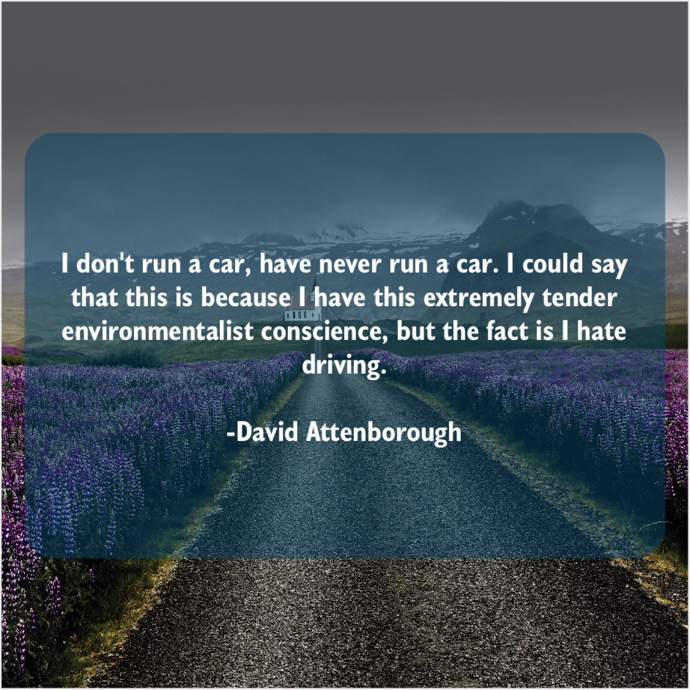 David Attenborough David Attenborough – I don’t run a car… January 28, 2019 admin “I don’t run a car, have never run a car. I could say that this is because I have this extremely tender environmentalist conscience, but the fact is I hate driving.”-David Attenborough