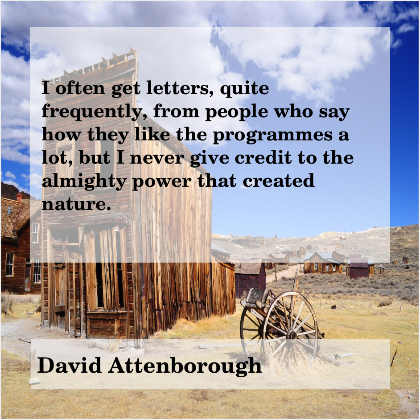 David Attenborough David Attenborough – I often get letters, quite… October 9, 2019 admin “I often get letters, quite frequently, from people who say how they like the programmes a lot, but I never give credit to the almighty power that created nature.”-David Attenborough