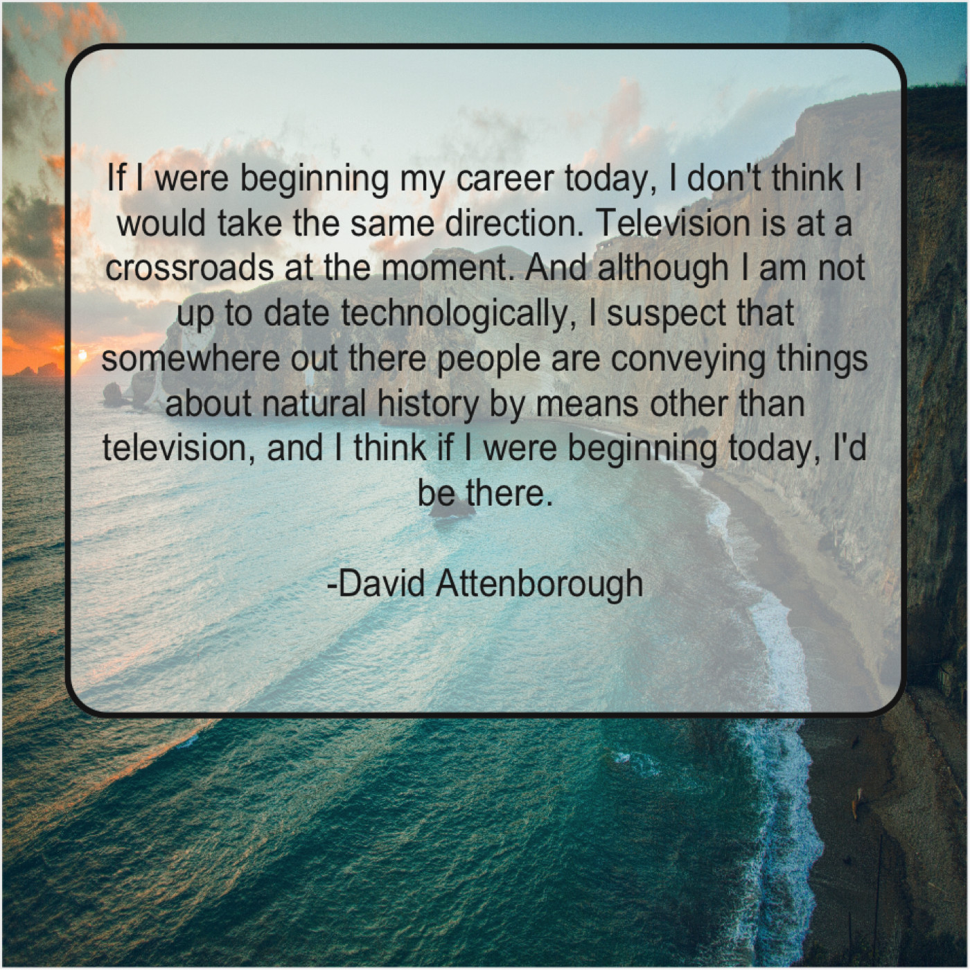 “If I were beginning my career today, I don’t think I would take the same direction. Television is at a crossroads at the moment. And although I am not up to date technologically, I suspect that somewhere out there people are conveying things about natural history by means other than television, and I think if I were beginning today, I’d be there.”