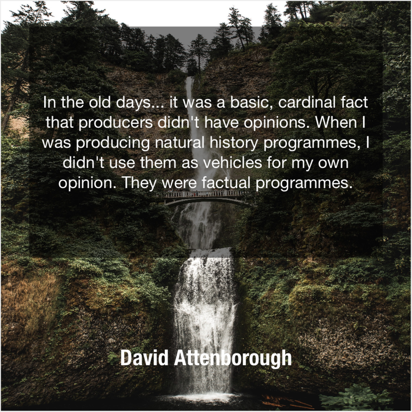 David Attenborough David Attenborough – In the old days… it… March 11, 2019 admin “In the old days… it was a basic, cardinal fact that producers didn’t have opinions. When I was producing natural history programmes, I didn’t use them as vehicles for my own opinion. They were factual programmes.”-David Attenborough