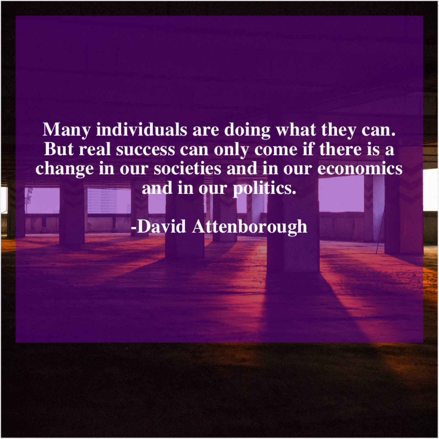 David Attenborough David Attenborough – Many individuals are doing what… February 6, 2019 admin “Many individuals are doing what they can. But real success can only come if there is a change in our societies and in our economics and in our politics.”-David Attenborough