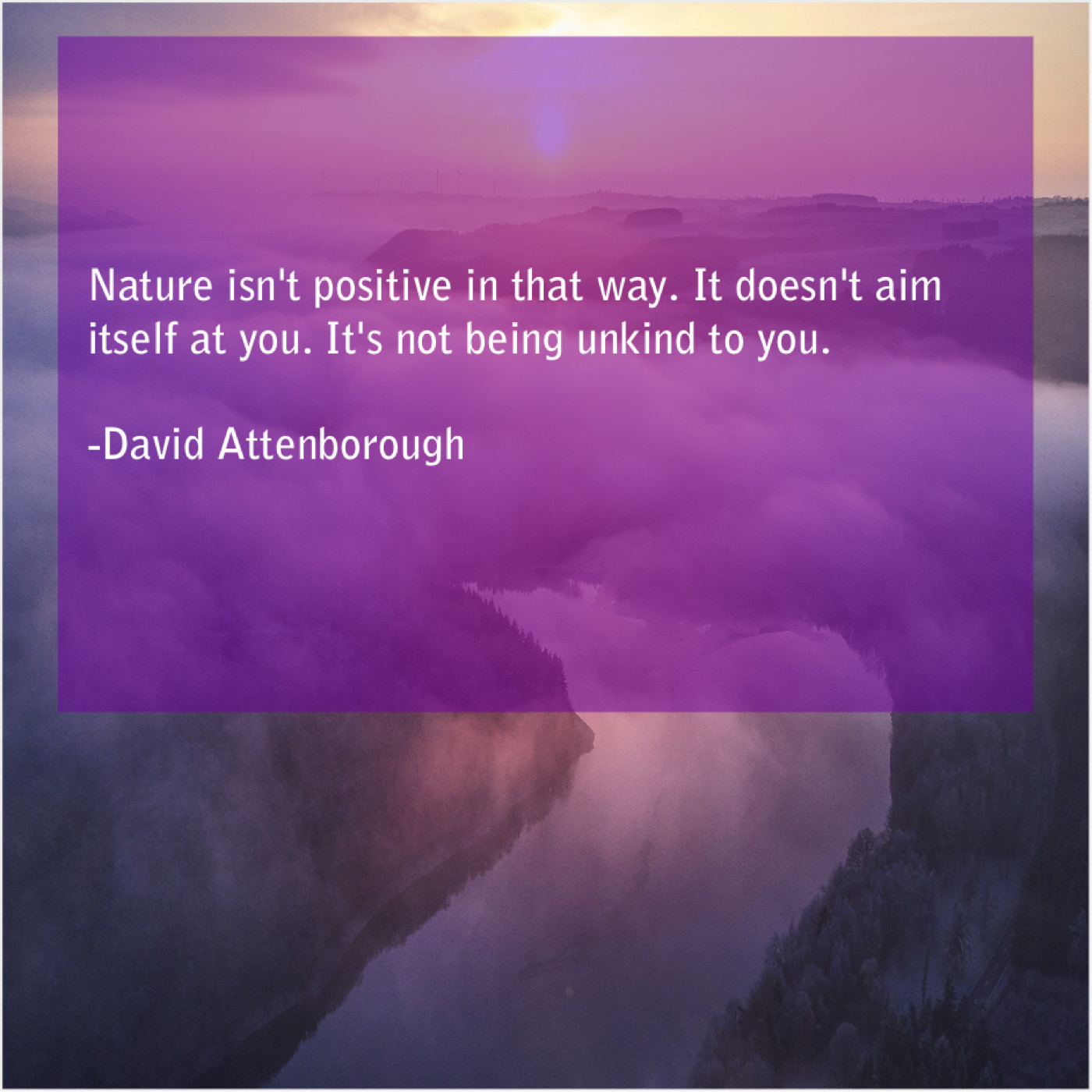 David Attenborough David Attenborough – Nature isn’t positive in that… May 25, 2019 admin “Nature isn’t positive in that way. It doesn’t aim itself at you. It’s not being unkind to you.”-David Attenborough