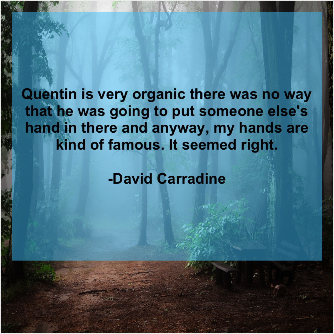 David Carradine David Carradine – Quentin is very organic there… March 22, 2019 admin “Quentin is very organic there was no way that he was going to put someone else’s hand in there and anyway, my hands are kind of famous. It seemed right.”-David Carradine
